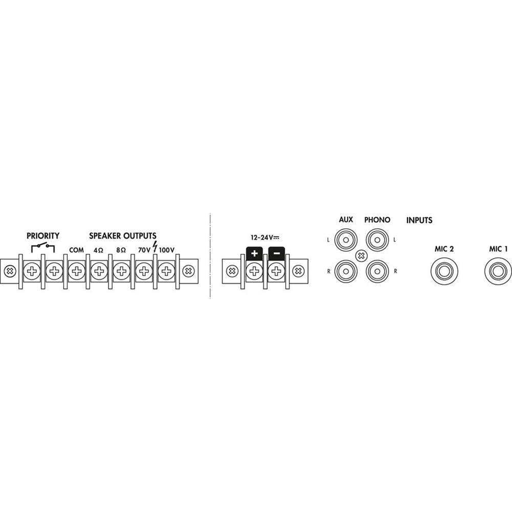 | Connections | 2 x 6.3 mm jack (mic), 1 x RCA L/R (aux), 1 x RCA L/R (phono), connecting terminals (speakers) |