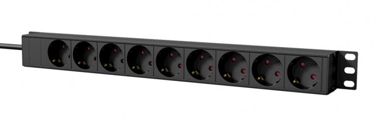 PSR1x9Gx er 19 "strømfordelingsskinne, der er kompatible med ANSI / EIA RS-310D, DIN41491 og IEC60297 standarderne. Konstruktionen er lavet med sort pulverlakeret aluminium forsynet med stål 19 "monterings beslag på hver side. Strømskinnen har 9 shucko-stik.