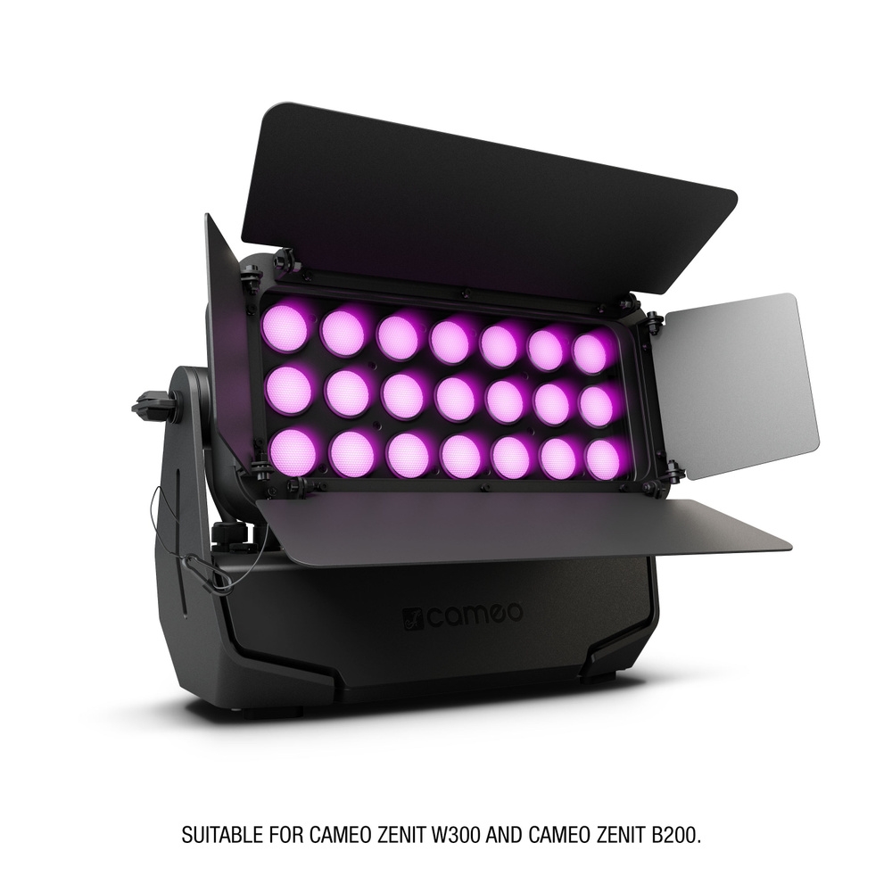 This 4-way barn door features 4 adjustable flaps that allow directing and narrowing the beam spread of the Cameo ZENIT® models' W300 and B200 for precise control. It installs in seconds only without the need for tools and can be used in combination with SnapMag® filter frames. The barn door integrates a safety rope.