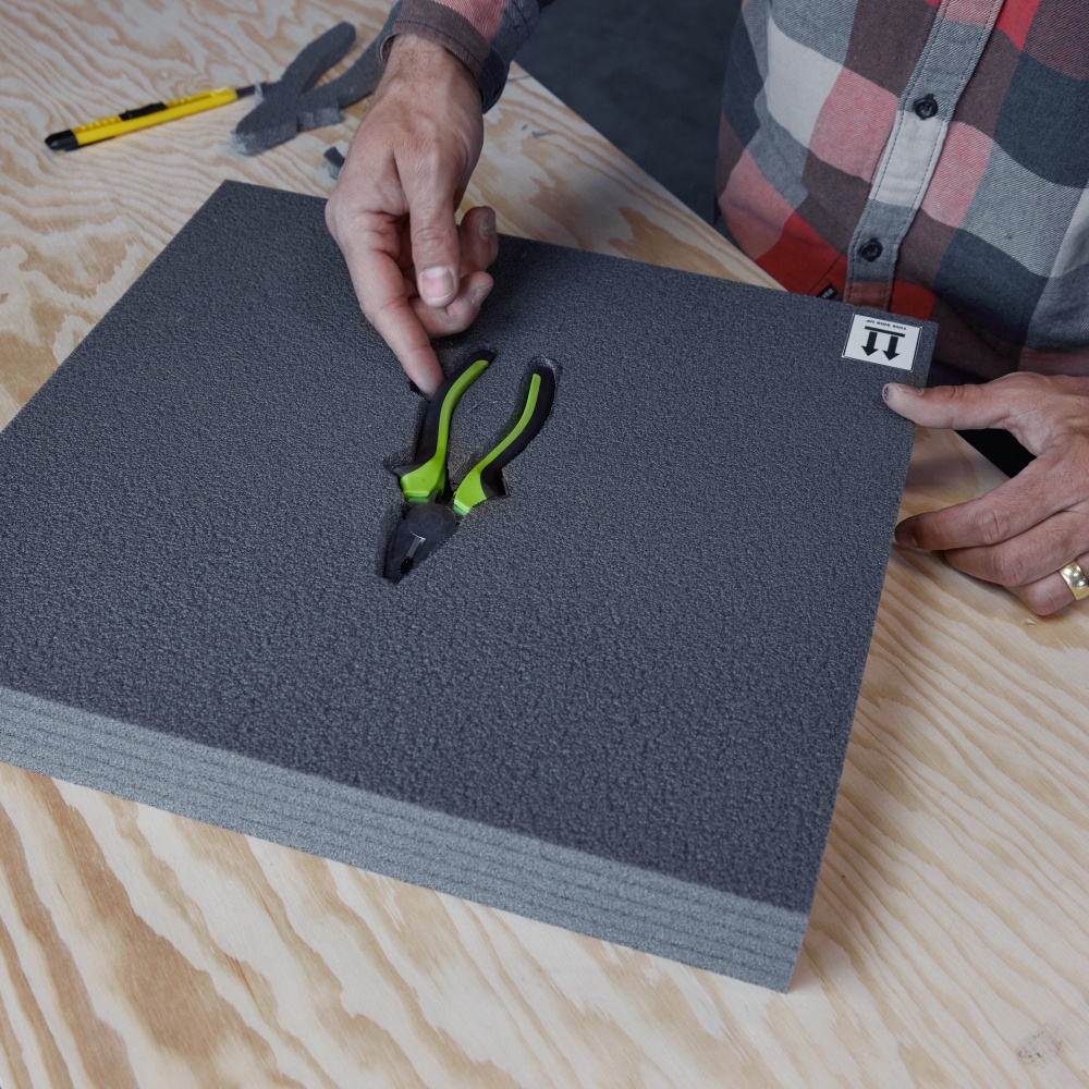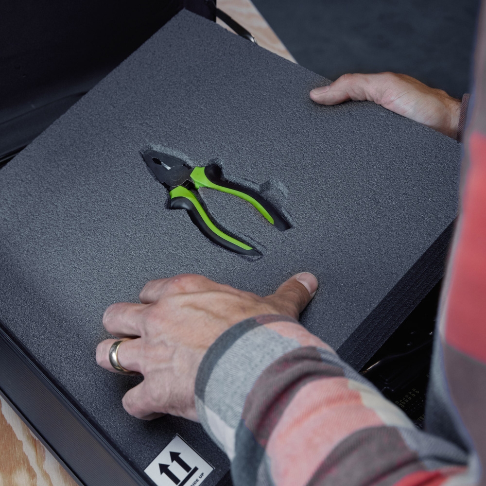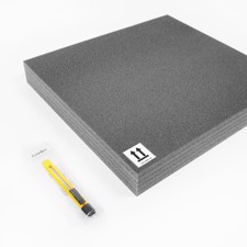 All that is needed to create a custom cavity is a sharp knife (included). The genius of Kyoto foam is that it consists of 5 layers that are firmly glued together, but can be separated from each other without leaving glue residue on the main part. This allows for different depth levels when cutting and does not require a CNC machine.