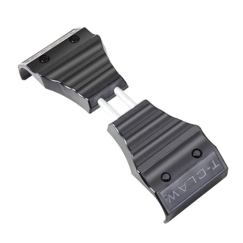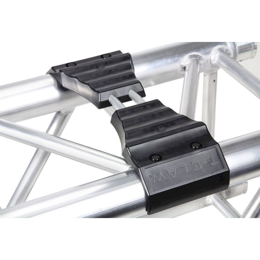 The T-Claw is a practical, smart solution for secure stacking of all standard trusses with an outer tube dimension of 290mm (e.g., Global Truss, Prolyte, Eurotruss, Adam Hall Truss), which clamps in place on top and is held by its own tension. Thanks to the special shape of the T-Claw and the inlaid rubber elements on the top, the trusses stacked on it are secured so that they do not slip and are protected against scratches. The waved profile on the bottom of the T-Claw permits easy hauling over smooth surfaces (for example, parquet, marble, or hall floors) and prevents damage to the underlying surfaces. The T-Claw is made of non-breakable black plastic with the dimensions 292 x 99 x 59 mm and weighs 288 g.