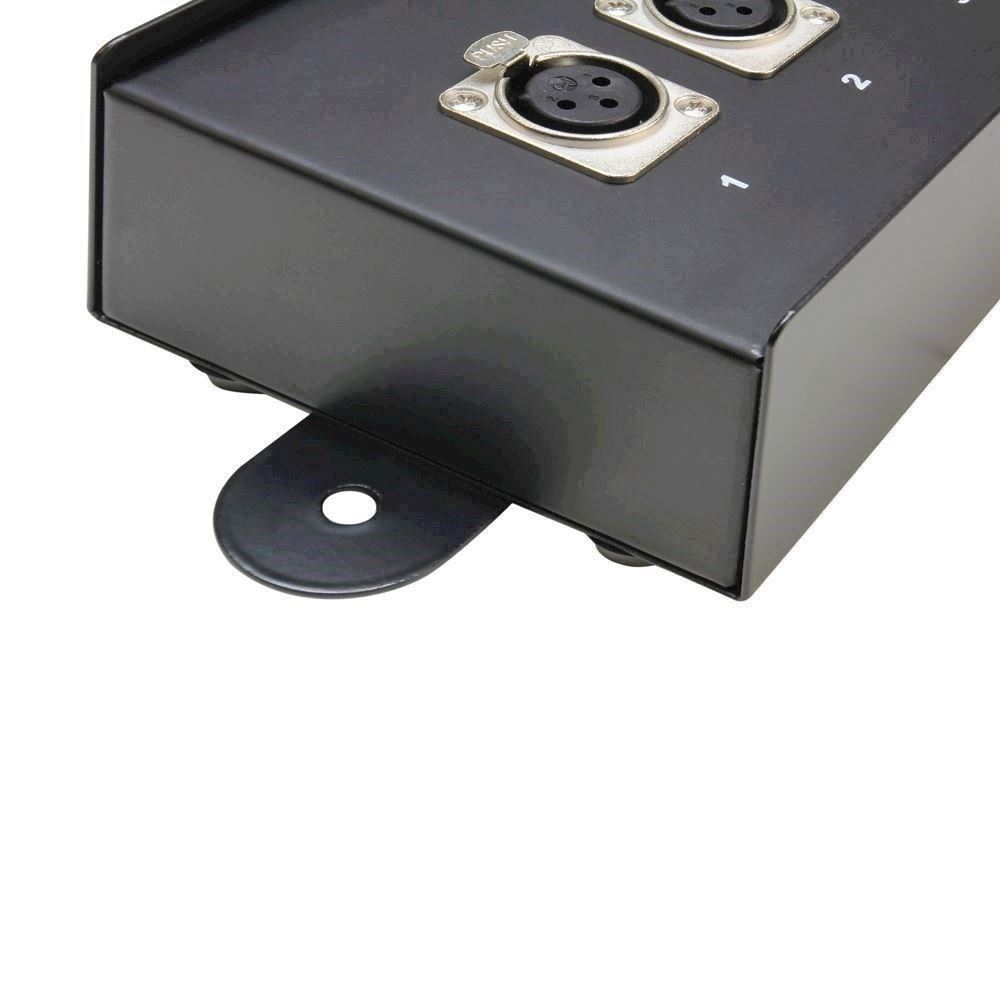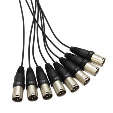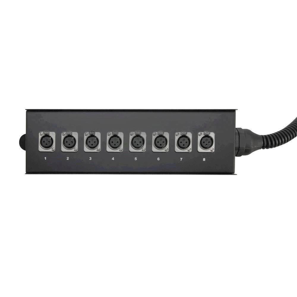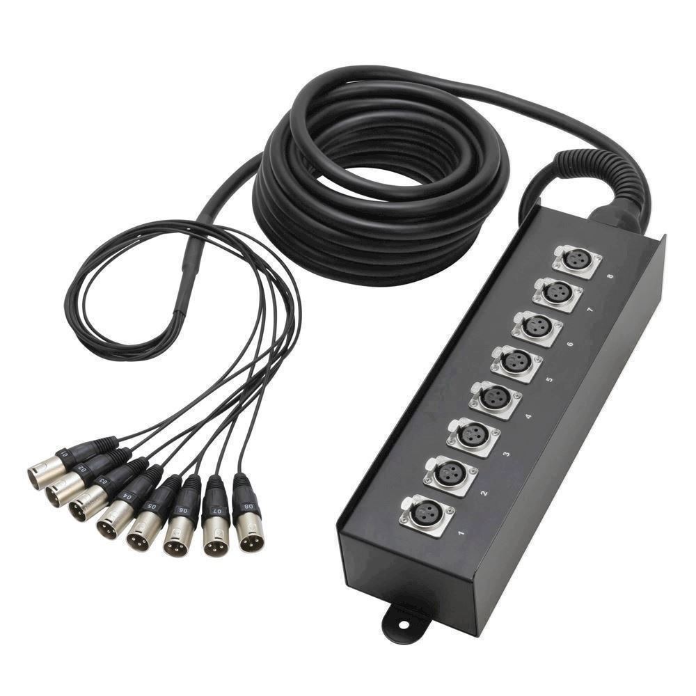 Eight-channel subcore with permanently attached ten-metre cable terminating in eight Adam Hall XLR plugs. The metal stage box has a mounting lug on the side; solid strain relief protects the sensitive transtion zone between box and cable. The additionally reinforced transition to the terminations prevents fatigue and cable breakage.