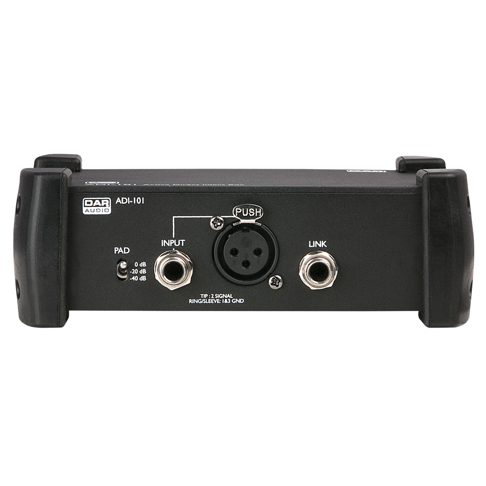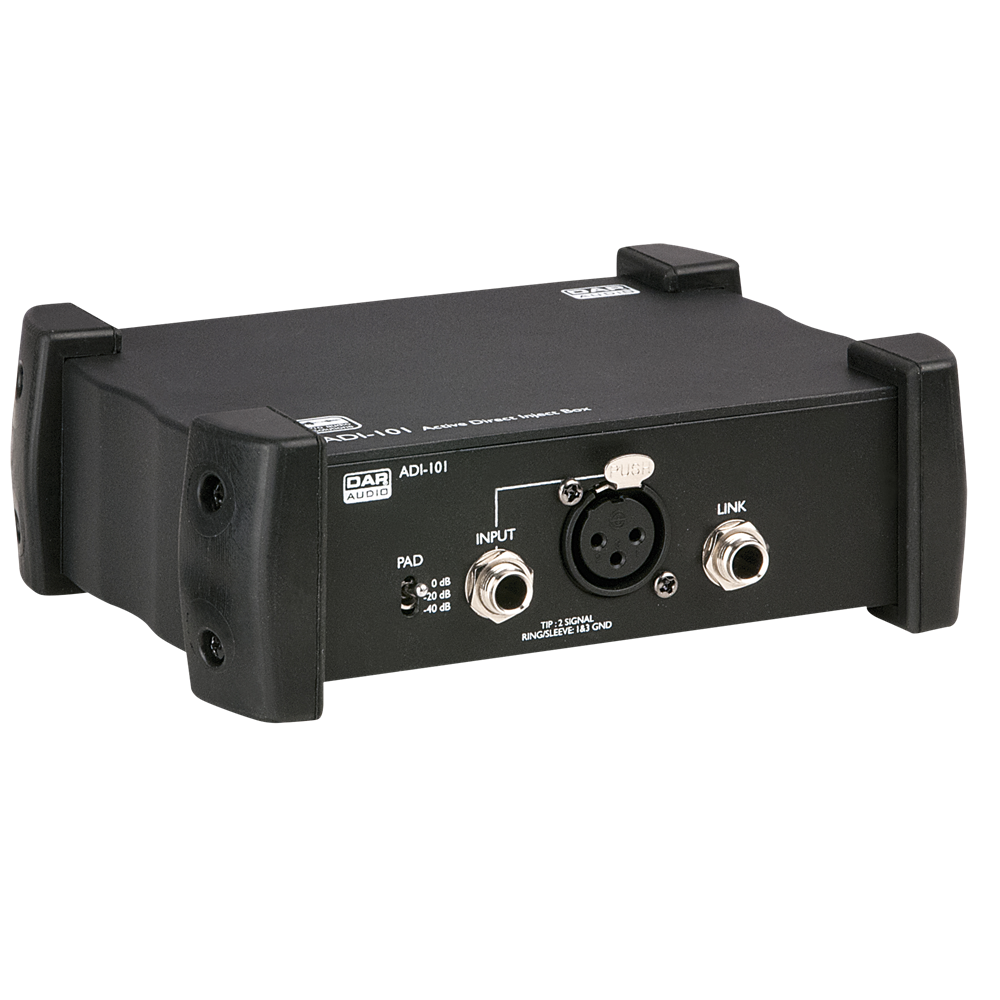 Den robuste konstruktion med metalhus og gummifødder gør ADI-101 velegnet til scenebrug, og strømforsyningen kan ske via enten 9 V batteri eller phantom power (18–48 V), hvilket sikrer fleksibilitet i opsætningen.