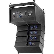 Professional PA speaker array (controlled by DSP software), active, 700 W (350 W+350 W)Compact array of high power capability with 4 mid-high range speaker units and a dual bass module, each section with its own 350 W power amplifier and controlling software (the configuration of the system is supported by a PC, but it operates as a stand-alone unit). Supplied with extensive and variable equipment for suspended mounting systems (Flyware). The mid-high range systems are each equipped with 2 x 10 cm (4") high-performance speakers and a magnetostatic speaker for a perfect reproduction rich in detail. The dynamic characteristics are absolutely convincing, at the same time the tonality at the basic setting is very pleasant. Despite its compact size, the bass module with 2 x 20 cm (8") bass speaker provides an amazingly deep bass reproduction and a high level stability which is only possible by using special bass speakers of very high power capability and the comprehensive DSP optimisation.