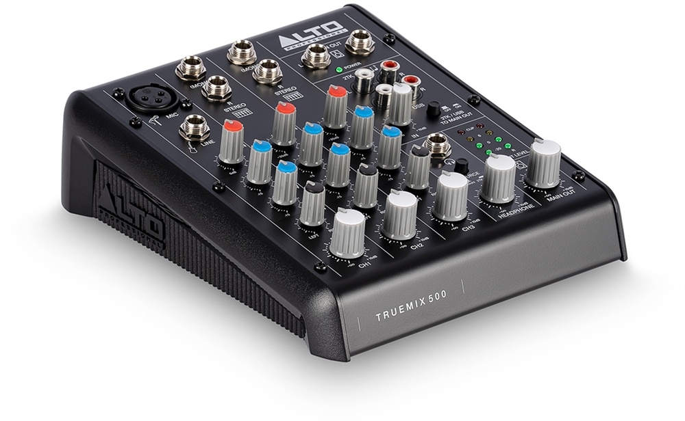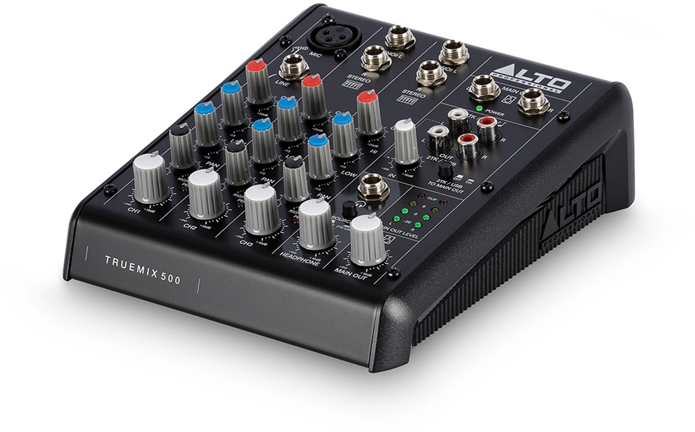 Alto Professional TrueMix 500 er en kompakt mixer, der leverer alle de væsentlige funktioner, du har brug for til hjemmeoptagelse, livestreaming, podcasting eller optræden. Der er 5 analoge indgange med højt headroom som sikrer minimal støj. Mikrofonindgangskanalen tilbyder XLR-indgang, der kan modtage såvel dynamisk som kondensatormikrofon med 48v phantom power. Denne kanal har også balanceret TRS linjeindgang til tilslutning af instrumenter og andre linjeniveausignaler. Der er desuden to stereoindgangskanaler, hver med dobbelte balancerede TRS-indgange. Alle kanaler har en to-bånds EQ med farvekodede knapper, der gør det nemt at tilpasse signalet, selv i ringe lysforhold.