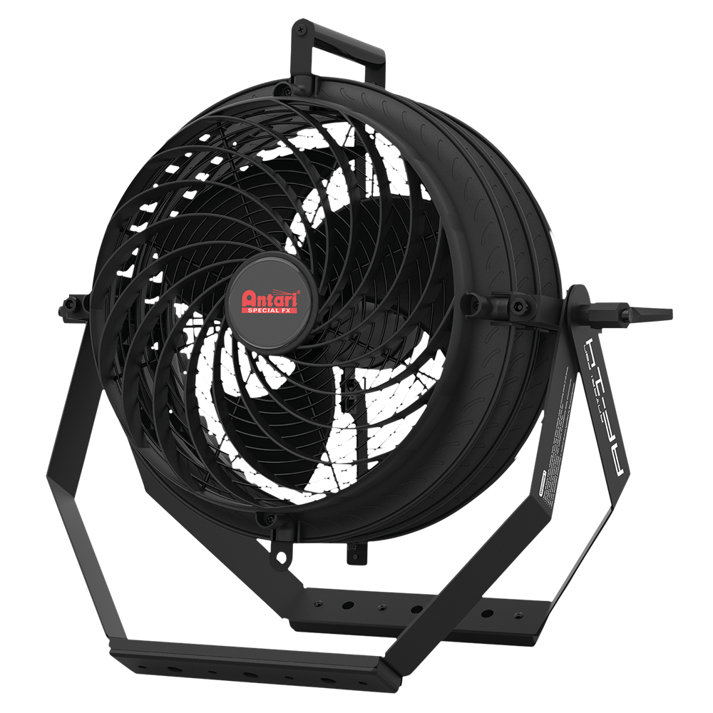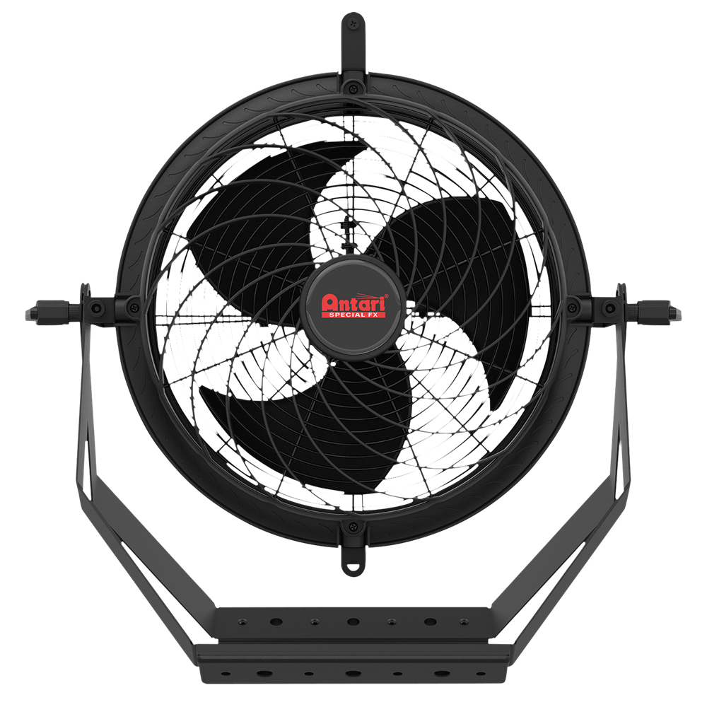 The Antari AF-14 IP Effects Fan is a high-velocity effects fan engineered for professional use in demanding environments such as theatres, concerts, theme parks, and live events. With its powerful 145 W motor and aerodynamic blade design, the AF-14 delivers focused, consistent airflow while maintaining low noise levels - ideal for fog dispersion and wind effects. Its unique swirl-shaped front cover reduces turbulence and concentrates the airflow, ensuring optimal performance with minimal sound (max. 59 dB). The IP55-rated motor and robust construction make it suitable for both indoor and (temporary) outdoor use, while the Seetronic IP power connector ensures secure and reliable operation. The AF-14 can be operated manually or paired with the included AFC-1 Fan Controller for advanced control via DMX. This allows precise adjustment of fan speed and timing, giving users full control over airflow intensity and duration.