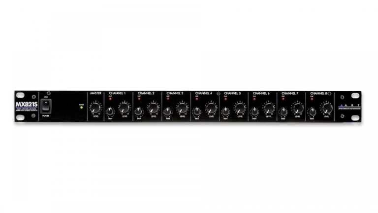 ART MX821S er en alsidig rackmount-mixer som kombinerer otte uafhængige input-kanaler i et stereo line-level output. Hver input-kanal accepterer et balanceret XLR mikrofon-input, eller et ubalanceret 1/4" TS line-level signal og tilbyder uafhængig niveau og panoreringskontrol.