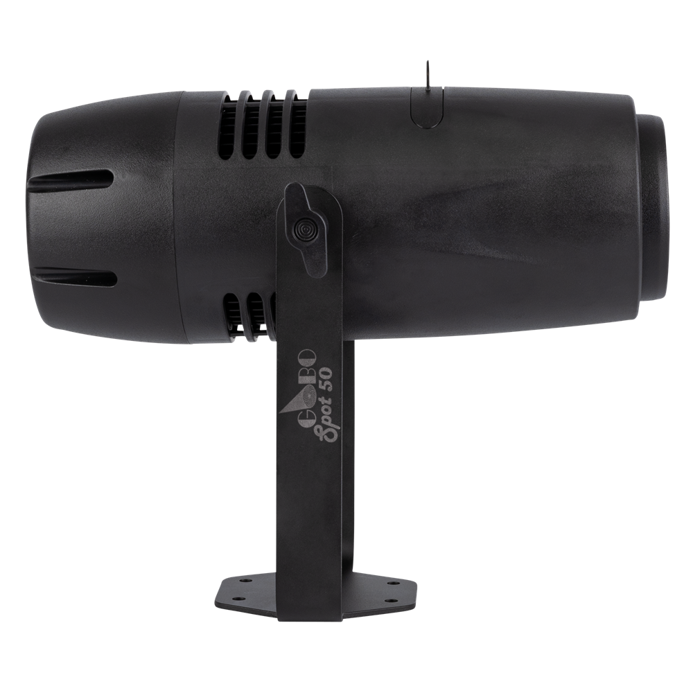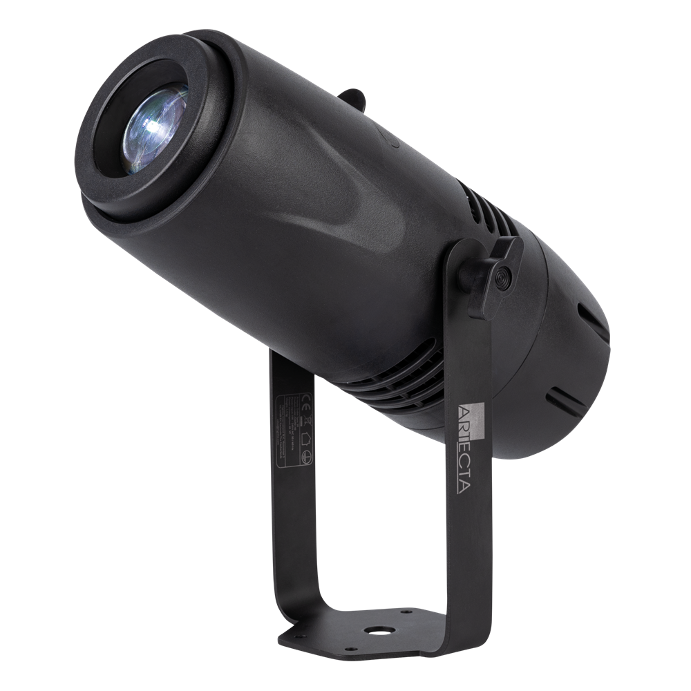 The Artecta Gobo Spot 50 is a compact 50-watt gobo projector designed for crisp, high-impact logo and pattern projection. With a fixed 20° beam angle and a replaceable, rotating glass gobo (Ø 26.4 mm), it’s ideal for retail, hospitality, exhibitions, and themed environments. The rotation speed and direction of the gobo can be easily adjusted via a control knob on the rear panel, offering dynamic visual effects without the need for DMX. For added flexibility, an optional 30° lens is available, allowing for broader coverage when needed.