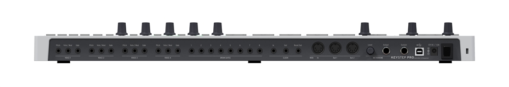 Your ever-growing collection of boutique modular gear, vintage synths, and software instruments can finally perform in unison, thanks to the jaw-dropping connectivity KeyStep Pro has to offer. 4 CV, Gate and Mod outputs, 8 dedicated drum Gate outputs, Clocks, MIDI in, 2 MIDI outs, a solo metronome output, sustain input to let you get expressive with your performance, and USB for easy power and DAW/softsynth control.