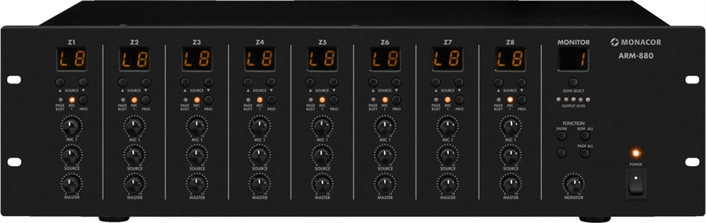 The system ARM-880... from MONACOR is a highly flexible PA solution for multi-room applications. It is ideally suited for applications in hotels, in restaurants and bars, in conference rooms, schools, sports facilities and fitness centres. Eight different audio sources, e.g. CD players, SAT receivers, radio programmes can be distributed to 8 output zones, assignment as required.