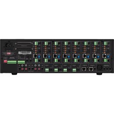 With a master/slave connection, it is possible to extend the system to up to 32 output zones. Connections for various alarm signals and a local microphone are available.