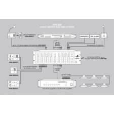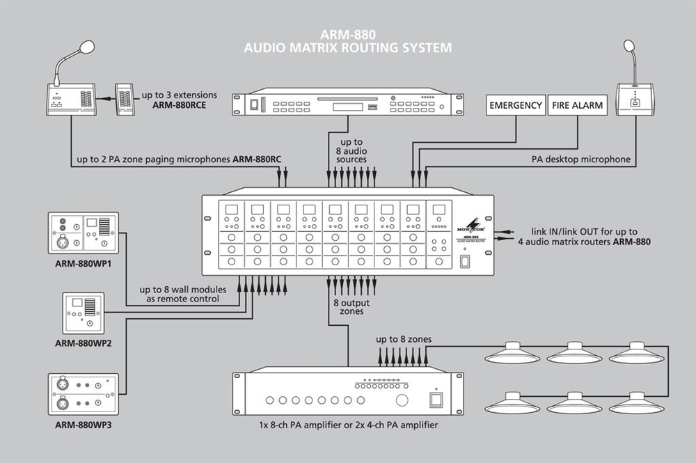 The audio matrix router ARM-880 is the centrepiece of the system. For operation, one amplifier is required for each output used. This may be an individual power amplifier or an active speaker system. Matching wall modules ARM-880WP1, ARM-880WP2 and ARM-880WP3 for remote control of ARM-880 or with additional local inputs for the respective zone are available at option.