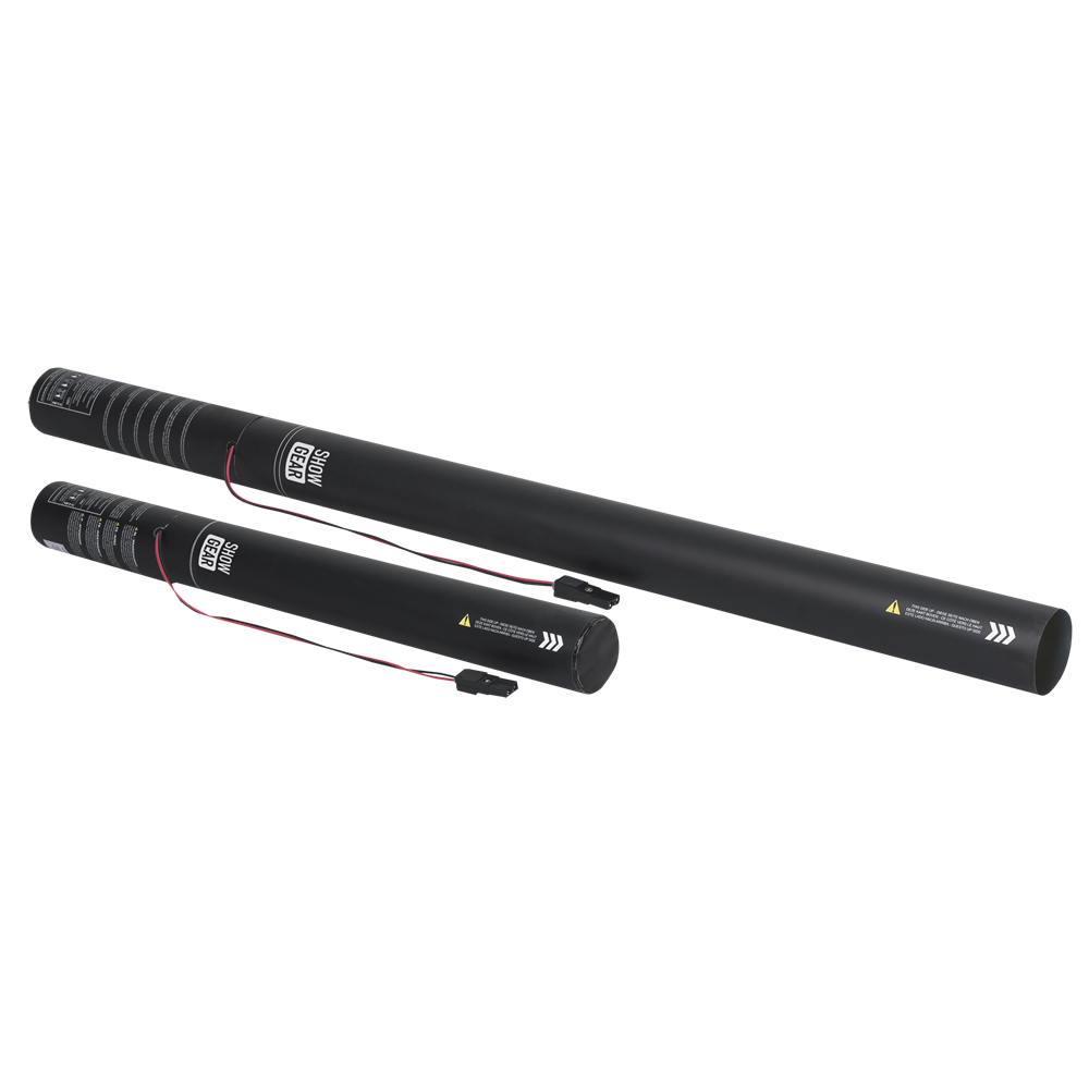 The Showgear electric cannon is a single use cannon, prefilled with confetti. To fire an electric cannon, the Showtec FX Shot (60908) is required. The bottom part of the cannon contains a pressurized nitrogen cartridge for a powerful effect.