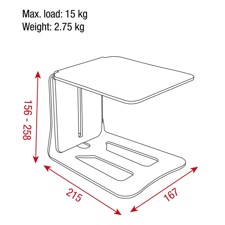 | Minimum højde (mm) | 156 mm | | Maksimal højde (mm) | 258 mm | | Materiale | Stål | | Vægt | 2.75 kg | | Maksimal belastning | 15 kg | | Lås |
