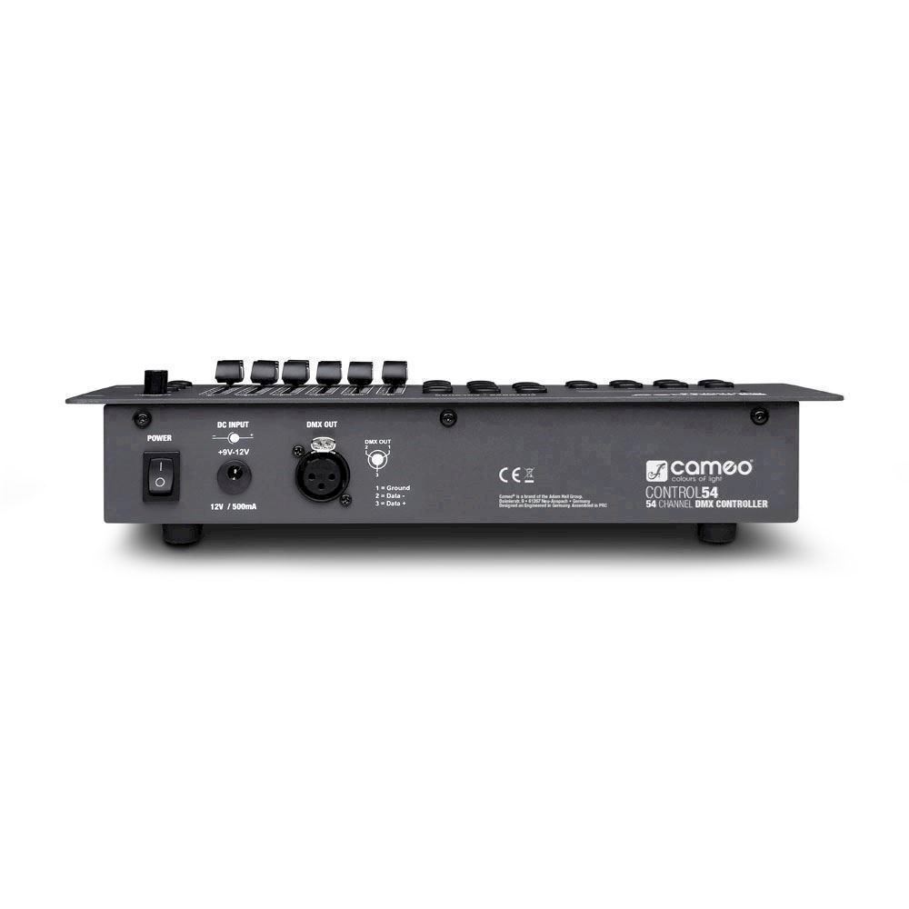 Cameo Control 54 leveres med en 9 - 12 V DC strømadapter og et 9 V batteri til valgfri batteridrift. Den er kompatibel med alle Cameo LED Barer, Cameo PAR Cans inklusive FLAT PAR PRO og FLAT PAR 1 serierne og andre enheder med RGB, RGBW, RGBWA og RGBWA+UV farveblanding.