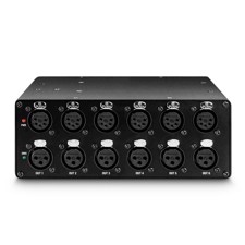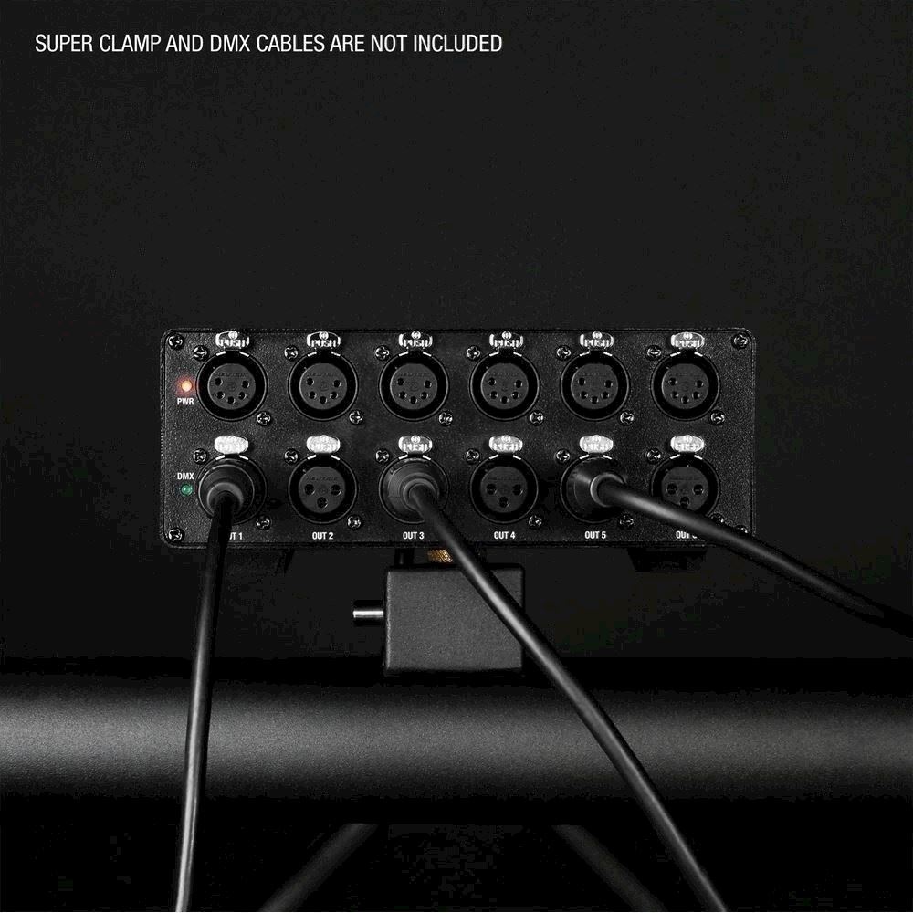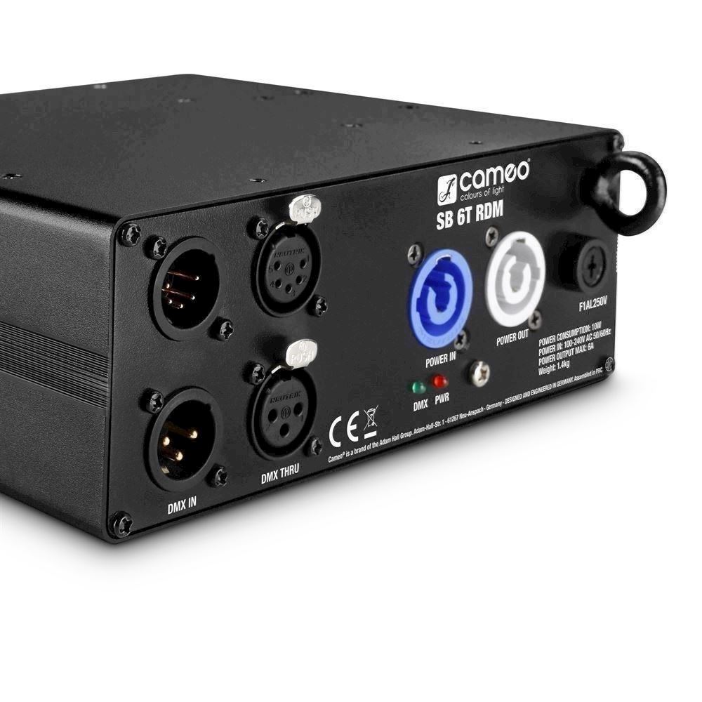 Designed for professional applications and supporting bi-directional communication, the Cameo SB 6T RDM is a 6-output DMX/RDM splitter with two inputs and two parallel thru outputs. It sends the incoming DMX/RDM signal to six separate output ports that are electronically and optically isolated. Each output channel has its own driver to boost the DMX/RDM signal to its original level. All inputs and outputs are fitted with both 3-pin and 5-pin Neutrik® connectors for maximum flexibility and reliability. Front and rear panel LEDs indicate the power and DMX status, and three M10 female threaded inserts facilitate truss mounting. The Cameo SB 6T RDM comes with a powerCON power cord.