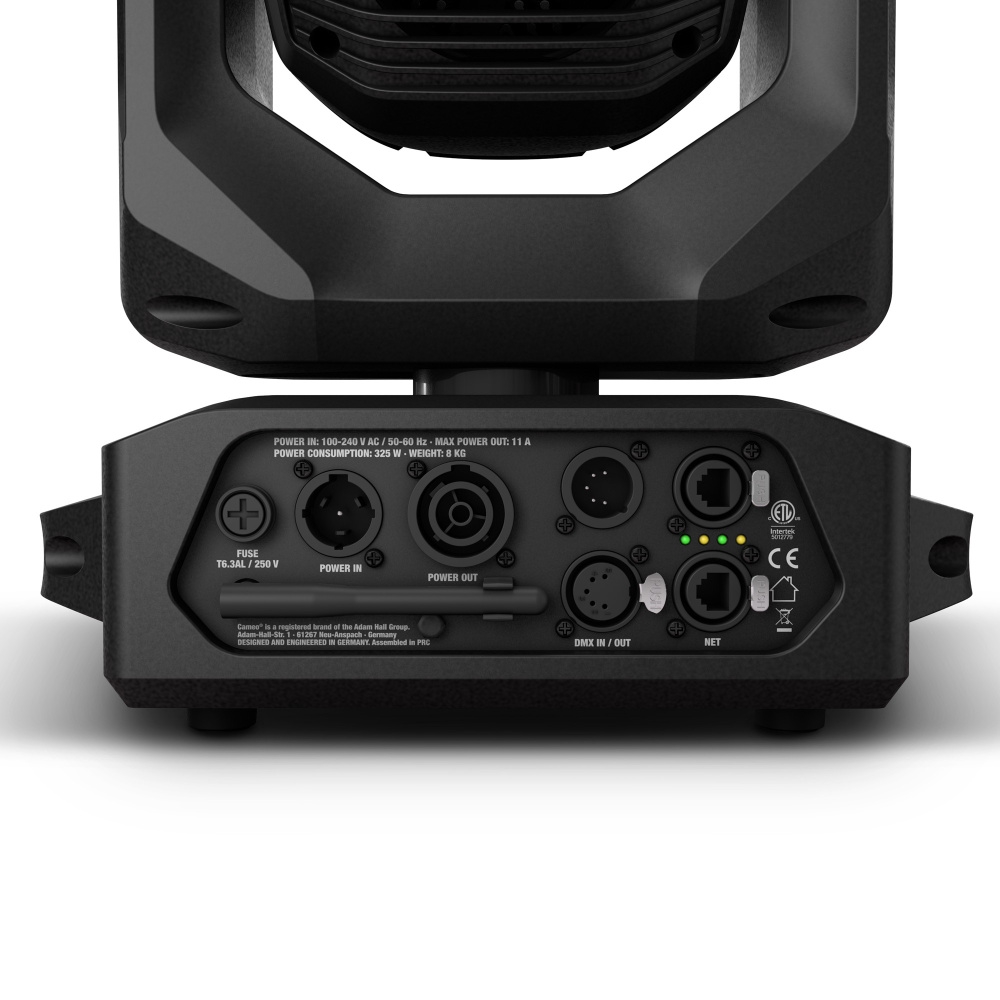 This wash-beam moving head guarantees flicker-free live broadcast images of events because the refresh rate can be adjusted in six steps between 800 Hz and a maximum of 25 kHz. Network-based software control is very flexible with DMX512, RDM, Art-Net4, sACN, KlingNet, or W-DMX. The intuitive encoder with battery-powered graphic display facilitates independent operation without the need for a power outlet. Preset LEE color filters enable problem-free use in combination with conventional headlights. The black, environmentally-friendly and fire-retardant ABS, nylon, and PC plastic housing is equipped with temperature-controlled fans, a power connection with a Neutrik TrueOne plug, and a 1 m power cable.