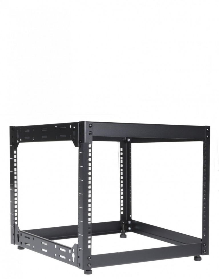 Caymon OPR509A 19" åben rackramme 9 unit Justerbar dybde fra 500 mm til 800 mm OPR509A er en dybdejusterbar professionel og solid konstrueret åben rammeholder til 19 "udstyr, der er kompatibelt med ANSI / EIA RS-310D, DIN41491 og IEC60297 standarder, der er egnet til vægmontering eller gulvmontering. Det sikrer maksimal installation, tilslutning og vedligeholdelse gør det nemt at opbevare op til 9 enheder på 19 "udstyr. Den åbne rammeholder har en justerbar dybde på 500 til 800 mm for nem installation og montering i eksisterende møbler. Den robuste konstruktion lavet af 2 mm tykt stål muliggør forudindlæsning af udstyret før transport til installationsstedet. Efterbehandling sker i en sort (RAL9004) pulverlakering med fin struktur, mens stansede monteringsprofiler på forsiden og begge sider giver en multifunktionel brug af kabinettet.