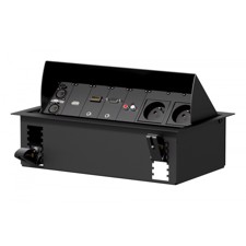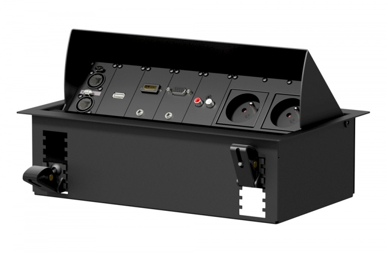 Caymon CASY028 gulvboks til 8 paneler i front CASY028 er et modulært bord- og vægmonterbart chassis, der kan monteres med 8 moduler fra CASY-serien. Den fleksible og modulære struktur sikrer maksimal alsidighed, hvilket gør det muligt for systemet at tilpasse sig specifikke krav. Mulighederne spænder fra lyd-, video- og dataforbindelse til strømforsyning, kontrolpaneler, strømforsyninger og mange flere. Den koldvalsede stålkonstruktion er udstyret med forindsatte hulindsatser, der muliggør modulinstallation med højst 8 enheder med indbygget dybde på op til 68,5 mm. Modulindsatsen kan monteres sammenmonteret, hvilket eliminerer risikoen for at droppe skruer eller dele inde i væggen eller bordet under modulmontering. Takket være BlindSnap monteringssystemet kan den monteres i enhver væg eller overflade uden adgang til bagsiden. Kabelindgang er mulig gennem store adgangshuller på bagsiden. Modulindsatsen kan åbnes og lukkes til en ren installation. Den samlede konstruktion er færdig med en sort (/ B) eller grå (/ G) struktureret og ridsefast pulvercoating.