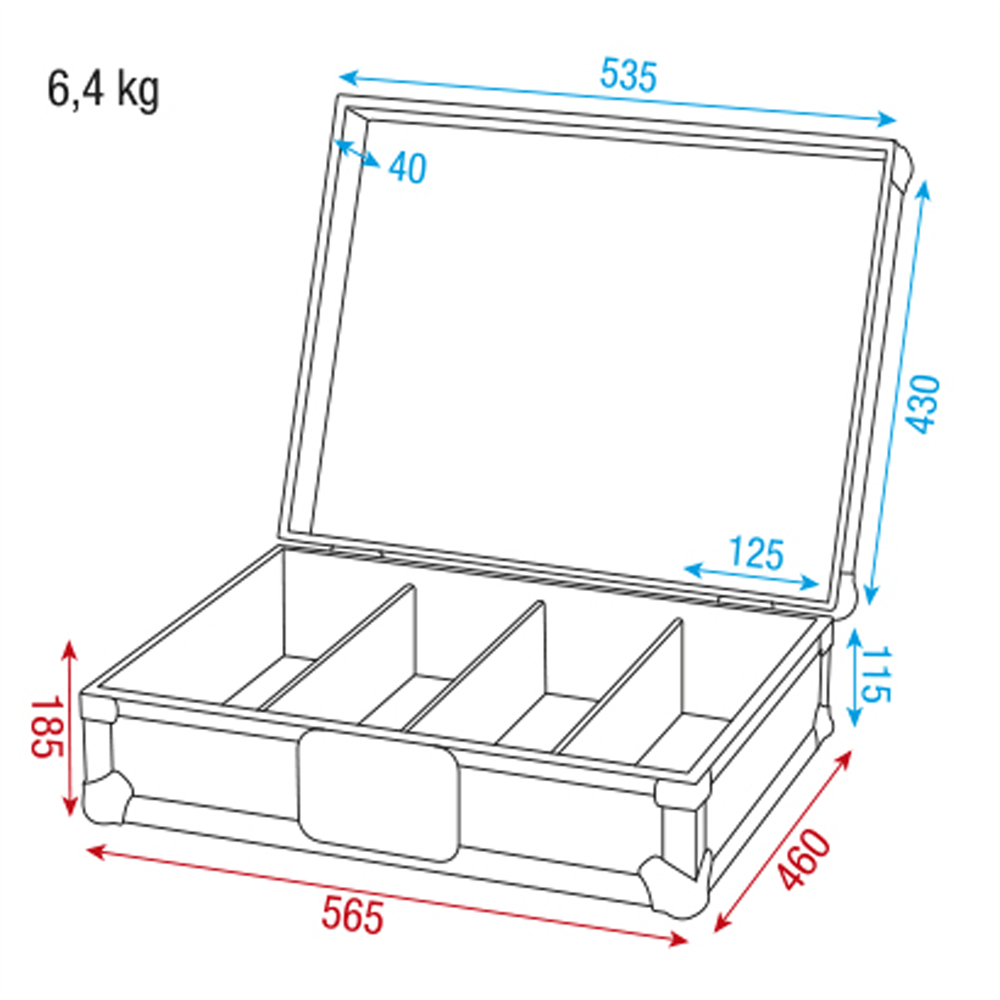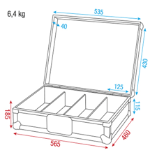 Flightcasen er fremstillet i robust træ med sort finish og har et aftageligt låg. Den er udstyret med to solide kuffertlåse samt et kraftigt fliphåndtag, der gør transporten nem og sikker.
