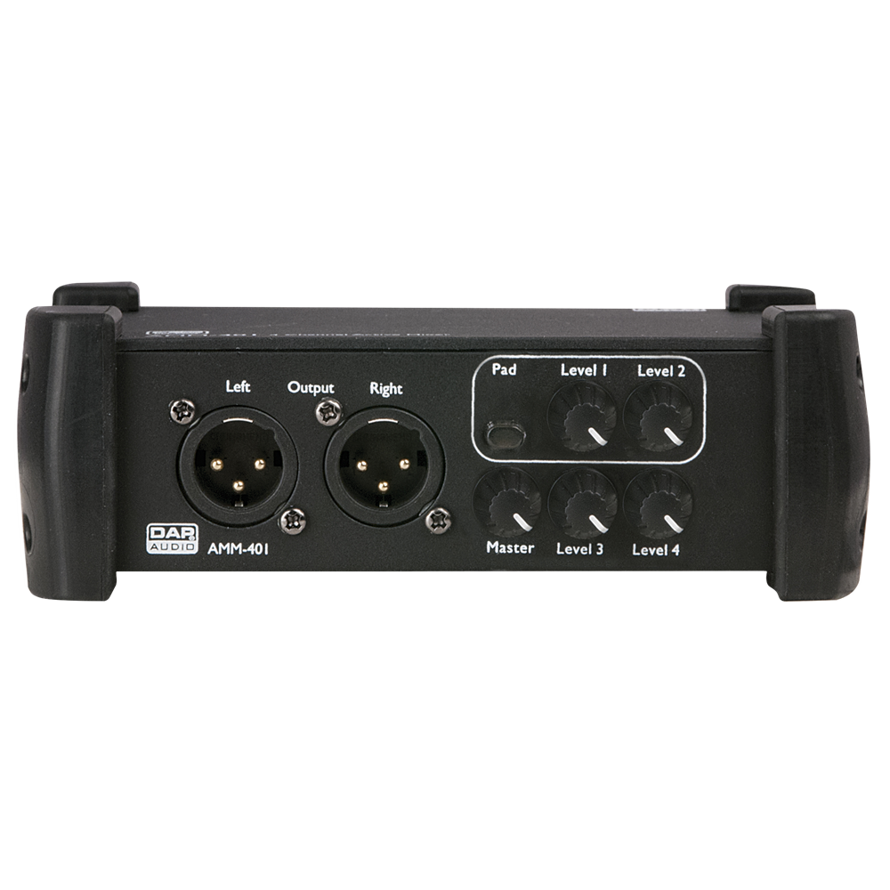 DAP AMM-401 er en 4-kanals aktiv mixer i et meget kompakt hus. Et ideelt audioværktøj til lydteknikere eller musikere, der regelmæssigt skal kunne improvisere. Den kan også være nyttig til at udvide en USB-audio interface med nogle ekstra inputs. Det er en meget simpel mixer med 4 volumenkontroller for 2 stereo- og 2 mono-indgange. De mono indgange kan bruges til instrumentmikrofoner, samt til linjeniveaukilder ved hjælp af PAD-afbryderen.