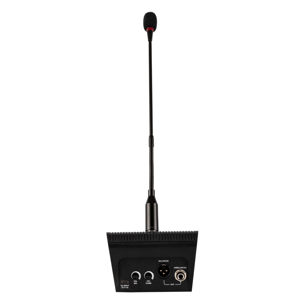 The BLI-10 is a condenser announcement microphone with a convenient push-to-talk control button and a flexible gooseneck. It also features a red LED ring, which lights up when the microphone is active. The built-in 4-tone chime can be used to attract attention before an announcement is made. With individual volume controls for the chimes and mic, a USB-C power input, and balanced and unbalanced outputs, the BLI-10 is easy and convenient to use. A power supply is included.