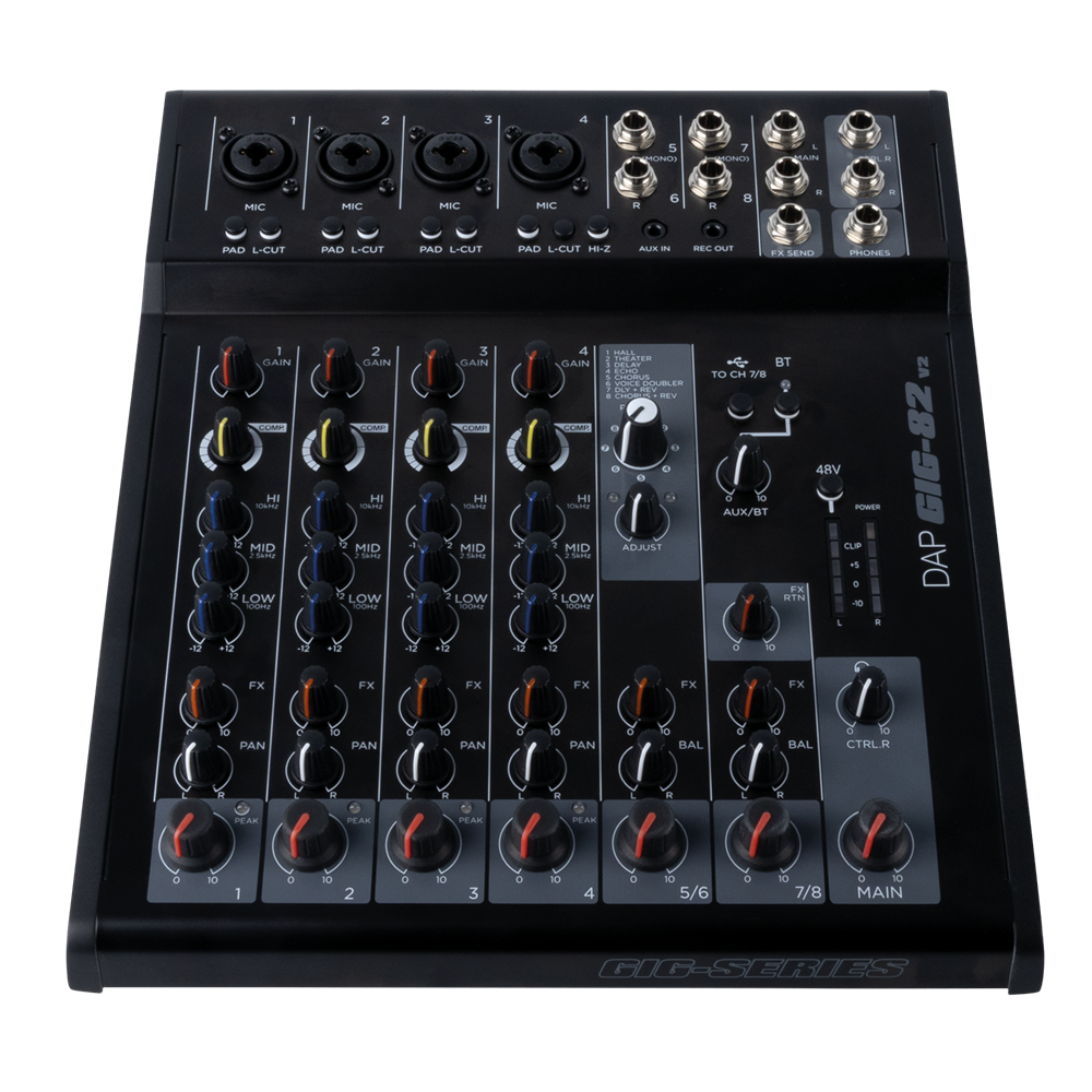 The DAP GIG-82 V2 is a versatile 8-channel analogue mixing console designed for live sound applications, small performances, presentations, and home recording setups. Despite its compact footprint, it offers a wide range of professional features and onboard effects that make it a reliable companion for musicians, sound engineers, and content creators.