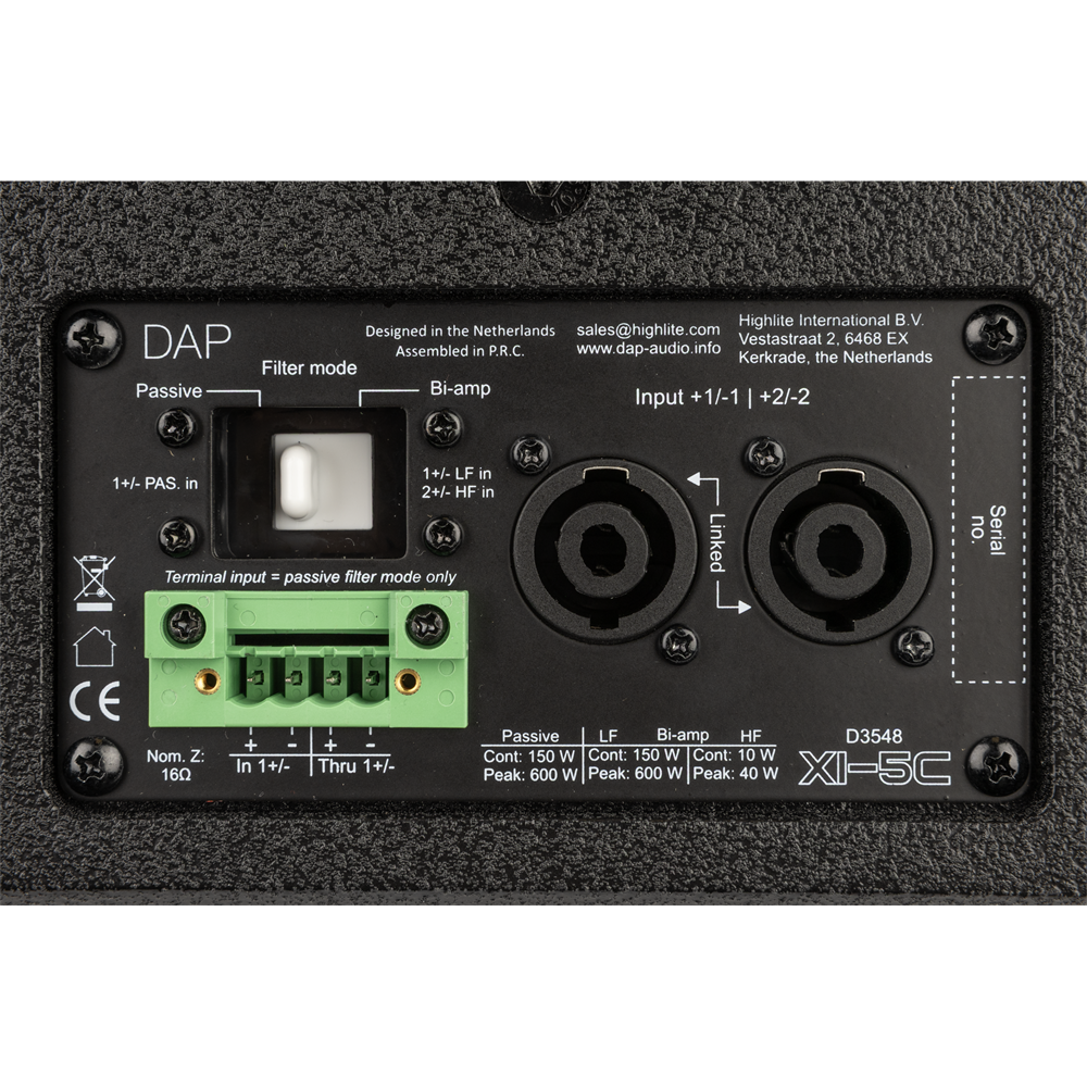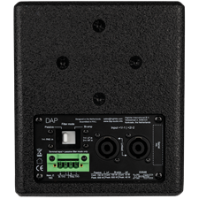 Installation is fast and reliable thanks to two linked 4-pole speaker connectors (supporting passive and bi-amp modes) for easy loop‑through and a 4‑pole terminal connector (passive mode only) with loop‑through for fixed wiring. A threaded M6 mounting point on top provides straightforward mounting options, the back features holes for the DAP Universal Speaker Bracket, and the sides have holes for the dedicated Hanging Bracket for Xi-5C. On the bottom side, an integrated 3/8” thread allows for mounting on a (microphone) stand. The robust black coating and steel screen grille ensure durability and a discreet look that blends into any interior.