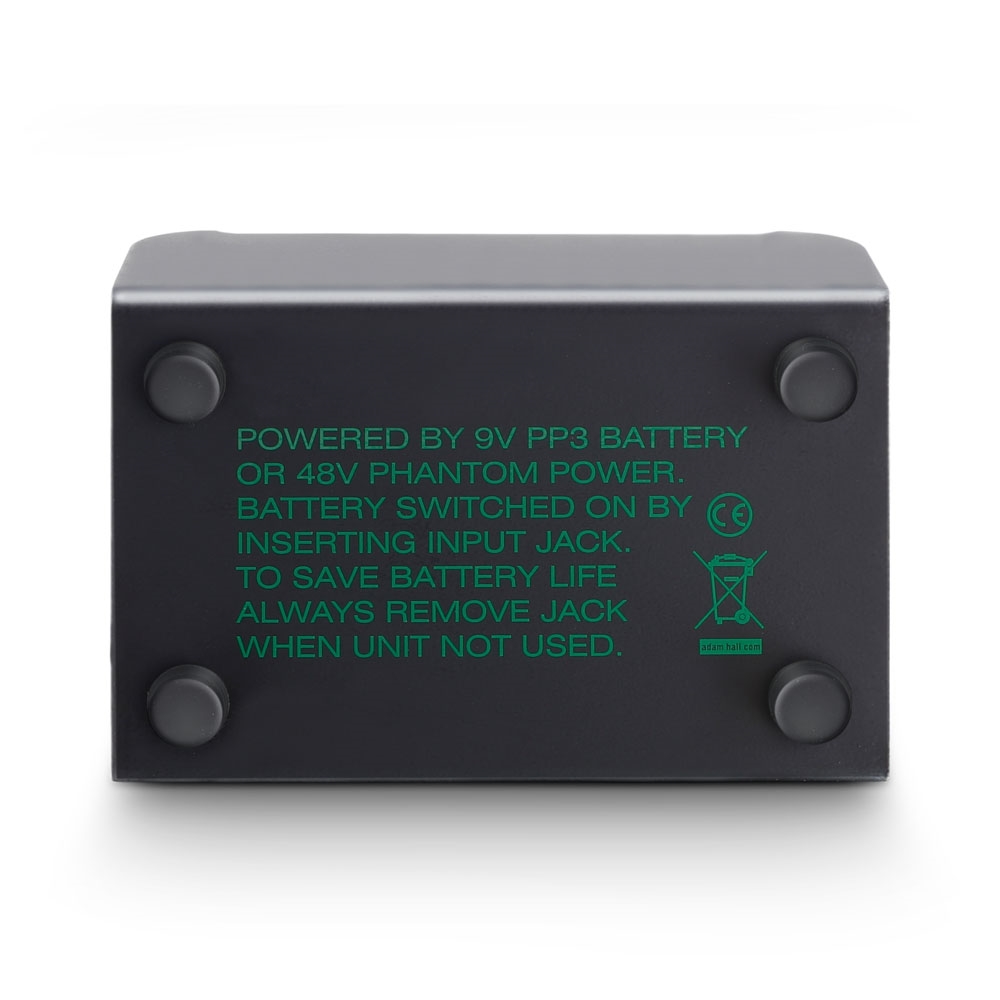 Standard active DI box. Can be operated with 9 V batteries or 48 V phantom power. High-impedance input; higher output level than with a passive DI box. Active circuitry allows for high input impedance ( 1 meg. ohm) and higher input sensitivity (typical difference between in and out -4 dB). Maximum output impedance with phantom power operation +10 dB. Output: transformer balanced. The special "floating ground" circuitry enables ground lift even during phantom power operation. Metal case 110 x 73 x 42 mm.
