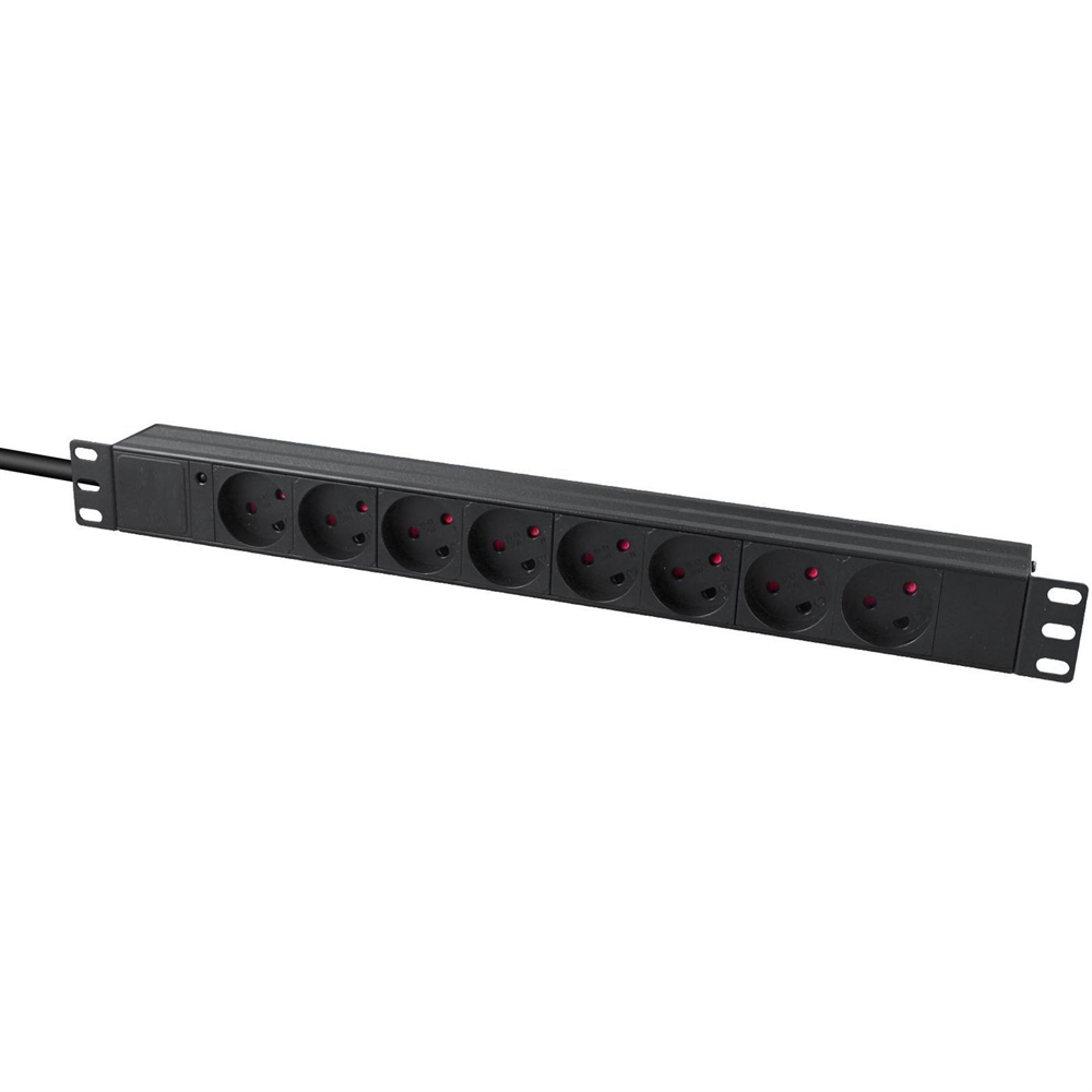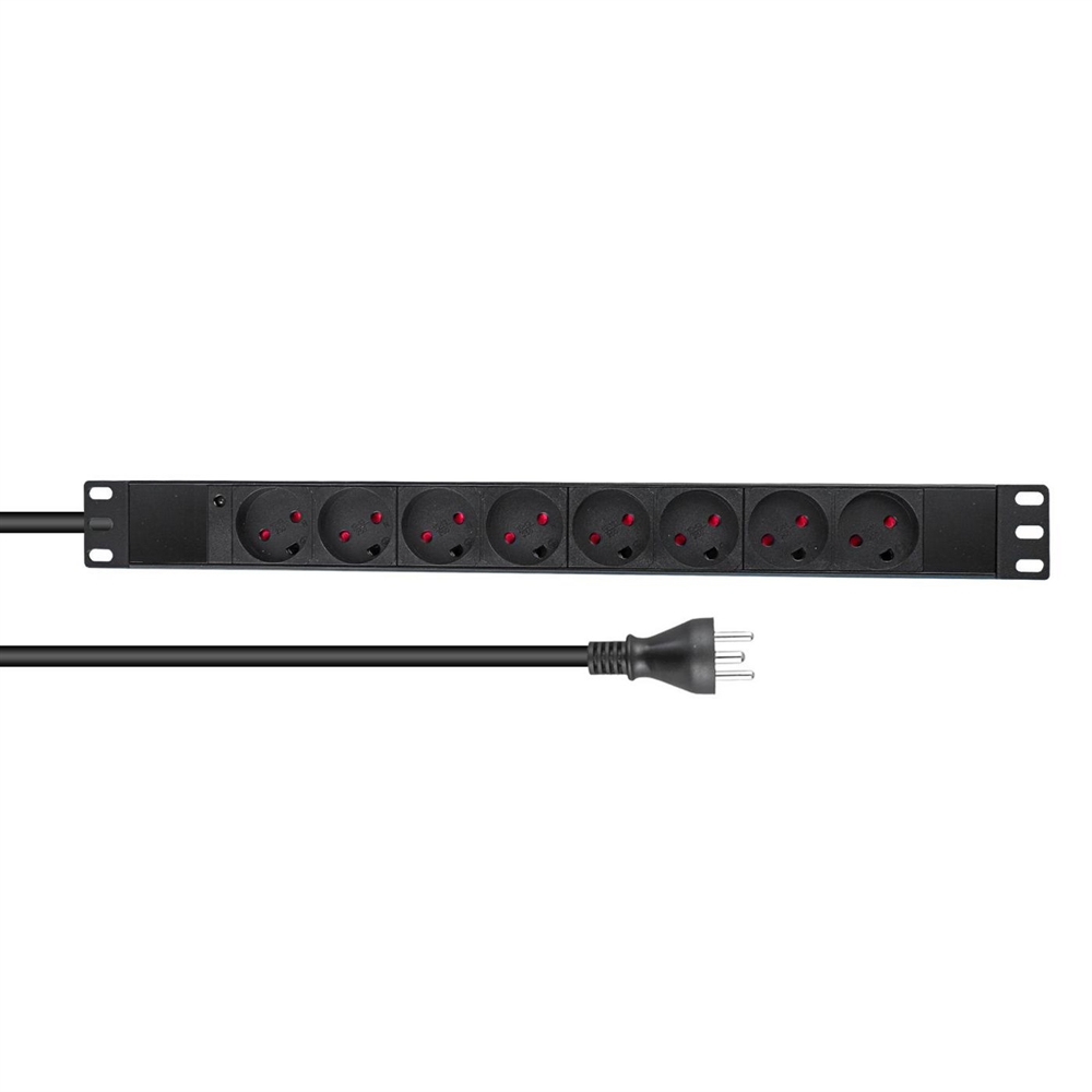Strømskinne til montering i rack, med 8 udtag m/jord til danske stik med jord.