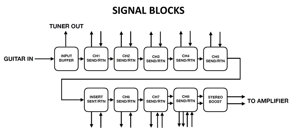 - Boost footswitch engages a knob adjustable, output gain Boost on both the left and right channels.