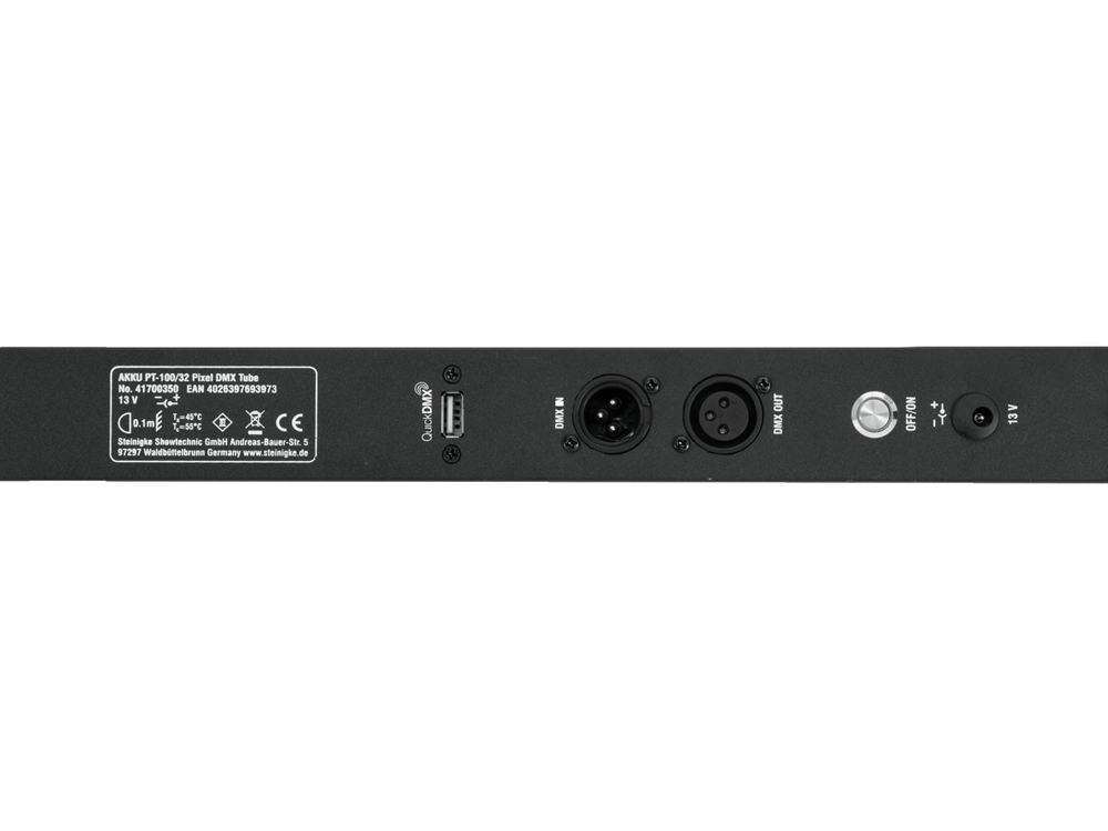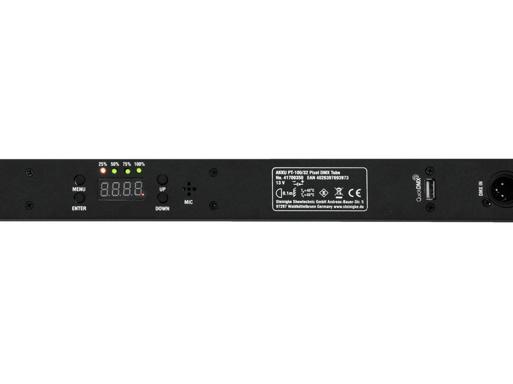 | Control: | Stand-alone; IR remote control; DMX; Master/slave function; Sound to light via Microphone; QuickDMX via USB (optional); W-DMX by wireless solution via USB (optional); CRMX by LumenRadio via USB (optional) |