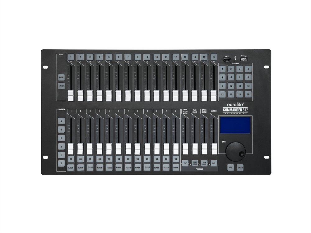A total of 57 memory locations are available for programming, 54 of which can be called up on nine faders via six pages. Three memory locations with page-independent faders can be called up at any time and are suitable for frequently used settings such as audience lighting, front lighting, or a hazer. Each memory location can contain a single mood or an entire sequence of a piece. The sequence can be run manually using the “Go”-button or automatically, whereby the speed can be saved, set using a speed controller, clocked using the Tap button, or music-controlled. This sequence control can be set individually for each memory location, including the fade time.