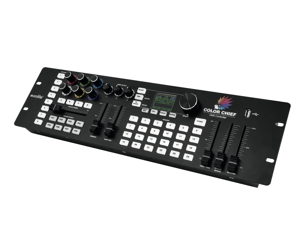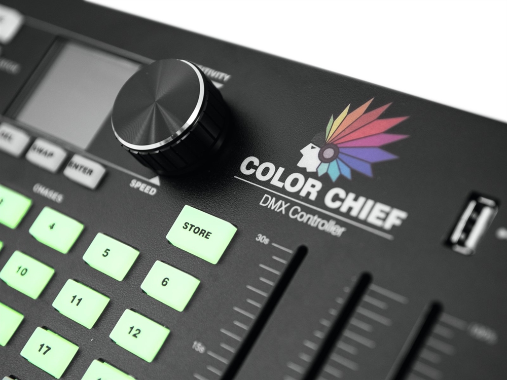 The Color Chief has a USB interface that can be used to memorize the entire control panel with all its settings and programs. You can memorize up to 24 complete setups on a USB flash drive. This way you can easily manage different shows or fixture arrangements.