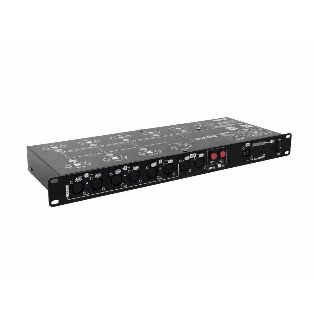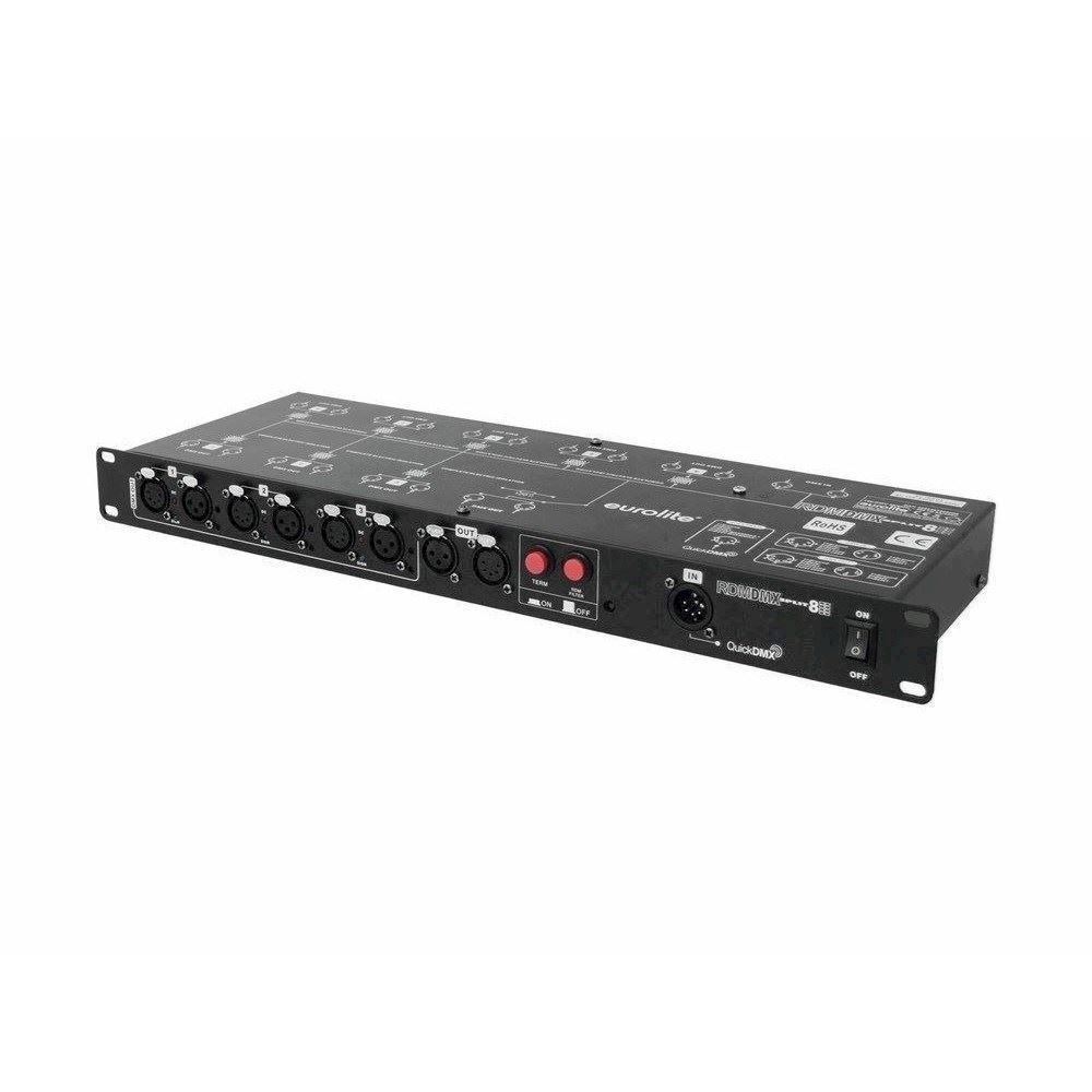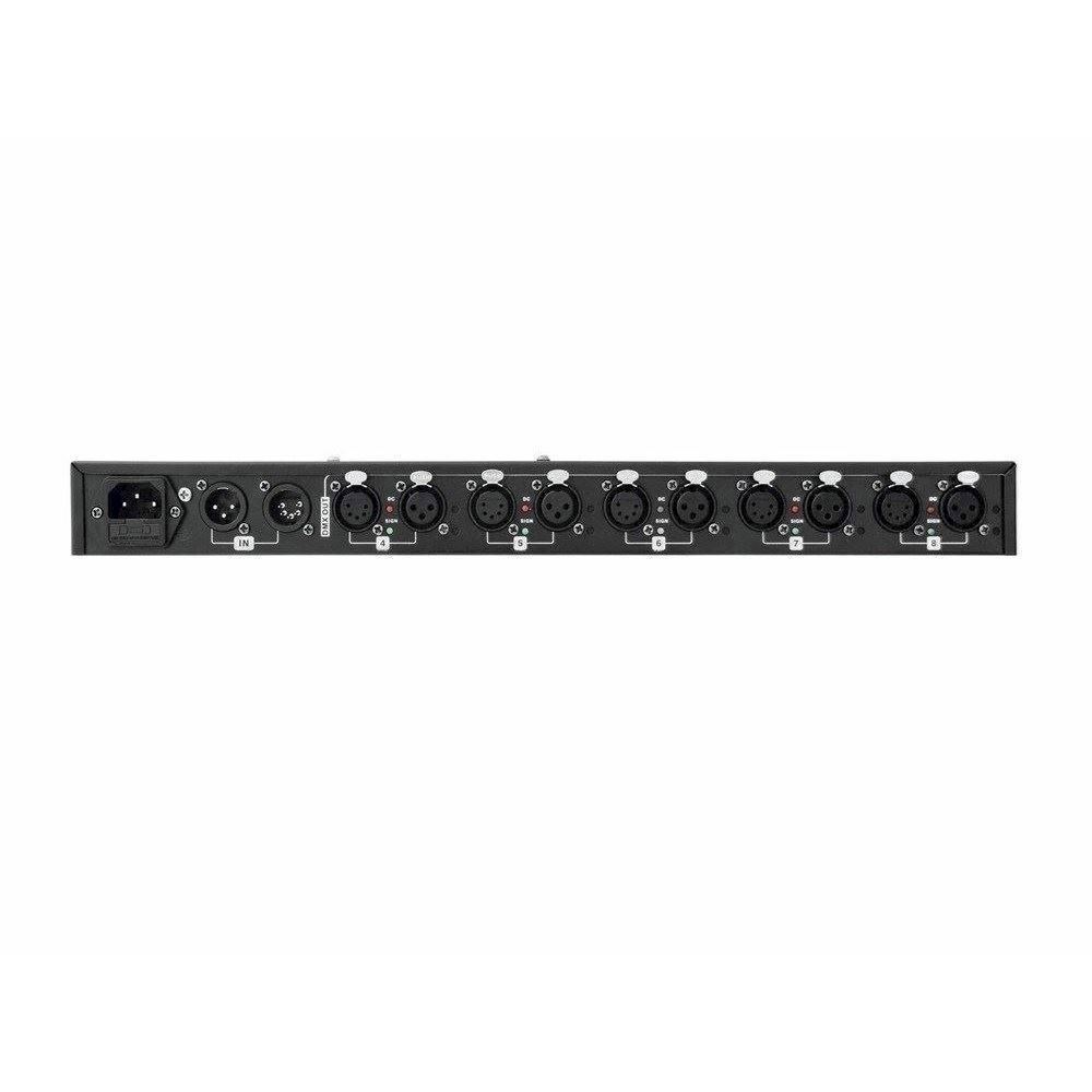 Her er du: Disconetto » LYS » Styring og Dæmper » DMX Splitter & Tilbehør Eurolite DMX Split 8X RDM Splitter, 3/5-pin XLR & QuickDMX På lager På lager, 3-5 hverdage Bedømmelse for Eurolite DMX Split 8X RDM Splitter, 3/5-pin XLR & QuickDMXProduktet er endnu ikke bedømt 2.349,00DKK ved 1 stk. Vis uden moms Trustpilot Splitter with 8 galvanically isolated outputs, 3/5-pin & QuickDMX XLR sockets Splitter with 8 galvanically isolated outputs, 3/5-pin & QuickDMX XLR socketsDMX splitter for splitting one DMX input signal to 8 DMX outputsConnections: 1 x DMX input, 1 x DMX feed-through output, 8 x DMX outputAdditional QuickDMX input for wireless reception of DMX signalsSupports RDM for bidirectional communication over the DMX lineSwitchable filter mode allows all RDM data to be filtered out in order to prevent problems when using fixtures intolerant of RDMInput and outputs XLR 3-pin and 5-pin eachInput and outputs galvanically isolatedEach DMX output with independent driver and status indicatorsInput and outputs with a set of respective power supply and internal fuseSwitchable termination resistorRack mounting Power supply:100-240 V AC, 50/60 HzDMX connection:3-pin and 5-pin XLRQuickDMX connection:5-pin XLRDimensions (L x W x H):483 x 145 x 45 mmWeight:2,5 kgPower consumption:5 WHeight:4,45 cmDepths:14,5 cmWidth:48,3 cm Varenr.: E-70064826