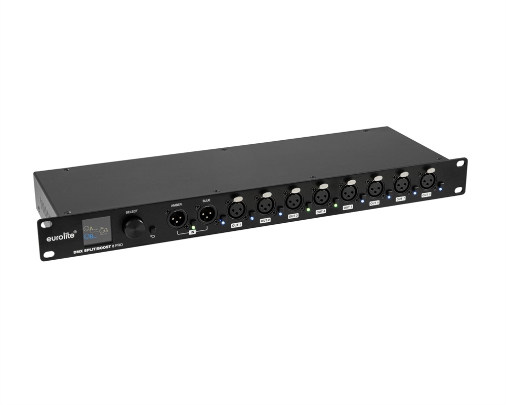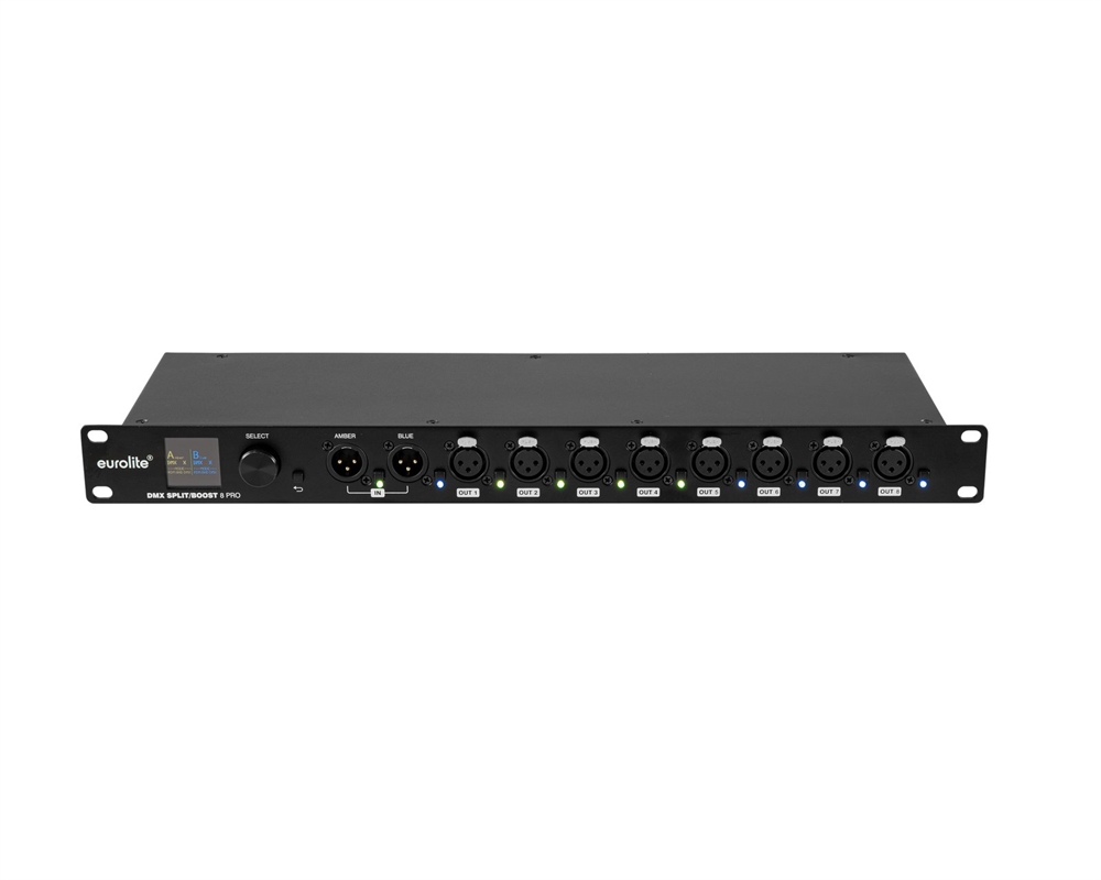 | DMX-output: | 8 x 3-stifts XLR (F) monteringsversion separat (galvanisk) med uafhængig driver og statusindikator |