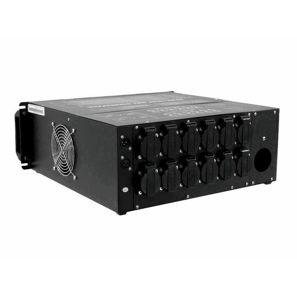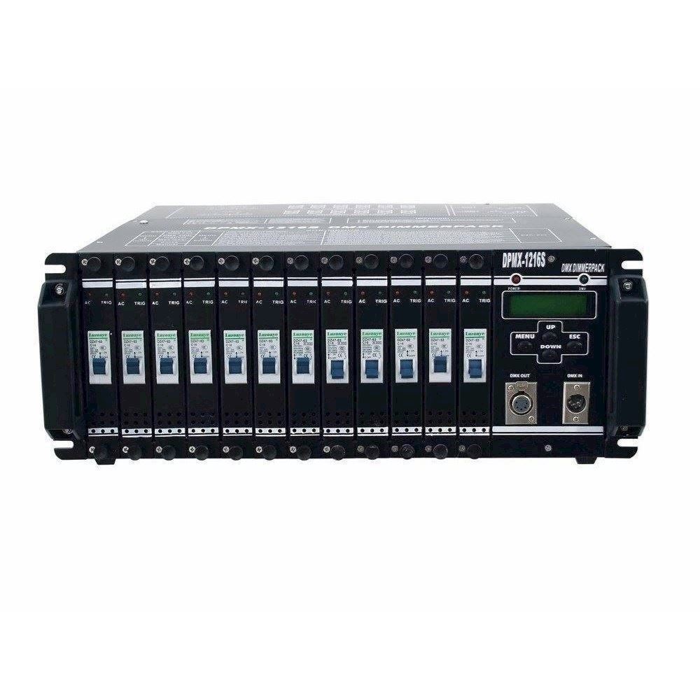 Her er du: Disconetto » LYS » Styring og Dæmper » Dæmpere & Switch Pack » Dæmpere & Switch Pack Eurolite DPMX-1216 S DMX Dæmper til 12 x schuko udtag På lager På lager, 3-5 hverdage Bedømmelse for Eurolite DPMX-1216 S DMX Dæmper til 12 x schuko udtagProduktet er endnu ikke bedømt 9.599,00DKK ved 1 stk. Vis uden moms Trustpilot 12 x 16A dimmer, service friendly modules, 12 safety sockets 12 x 16A dimmer, service friendly modules, 12 safety sockets12-channel dimmer pack with up to 16 A output per channelModular design of the individual dimmer modules for quick and easy change3-phase or 1-phase power supplyDMX512 control or analog controlAdjustable lamp preheat (0-50%) and limiter function to prolong bulb lifeCurve function for selection of different fade modesDim or switch option assignable to each channelDMX Fail function: automatic digital input check to detect DMX signal errors12 built-in programs with adjustable speedManual mode for dimming capability without an external lighting controllerAll modes are displayed via LCDSynchronization of several devices possible via DMXAutomatic circuit breaker per channel (type C)Channel outputs on the rear panel via safety socketsRack installation with 4 UOnly for professional use Power supply:230-380 V AC, 50 Hz Max. power output:43470WMax. current:189 AMax. output/channel:3680 WMax. current/channel:16 ANumber of control channels:12Integrated programs:12Fuse:12 x C 16 A, 230 VDMX output:3-pin female XLR socketDMX input:3-pin male XLR socketOutputs:Safety socketsDimensions (W x D x H):482 x 485 x 176 mmMinimum mounting depth:500 mmWeight:27 kgNumber of DMX channels:12Max. power output:43470 WColor:BlackHeight:17,8 cmDepths:48,5 cmWidth:48,3 cm Varenr.: E-70064182 Vi anbefaler Eurolite DPMX dæmper-Modul 1216 MK2 DKK 609,00