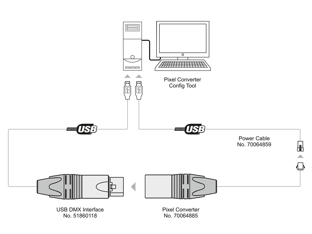 Supplys only power! For the Configuration of the "DXT DMX Pixel Converter PRO" you will need an additional "USB-DMX512-Interface/Upload Adapter" (51860118)!