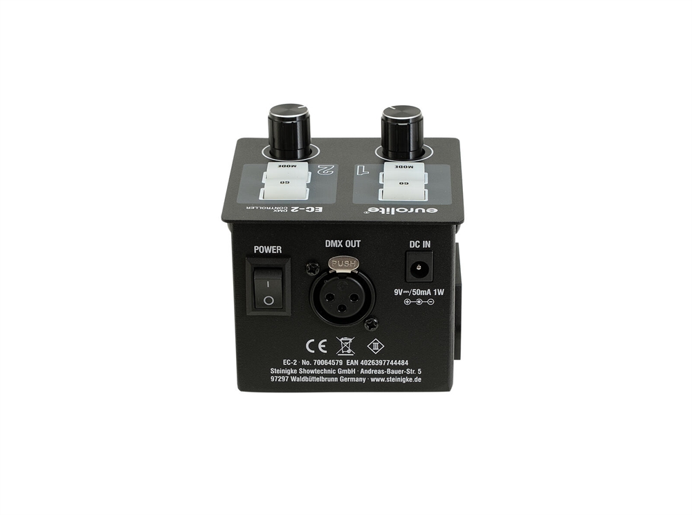 EC-2 er en kompakt 2-kanals DMX-controller med 3-pin XLR-udgang. Den bruges til let betjening af røgmaskiner, strobe lys, og andre DMX-styrede enheder på scenen. Hver kanal har en baggrundsbelyst udløser- og tilstandsknap samt en kontrolknap til indstilling af DMX-værdierne. Et M10-gevindindsats gør det muligt at montere på f.eks. et mikrofonstativ. Levering inkluderer en strømadapter. Drift med et 9 V batteri er også mulig.