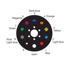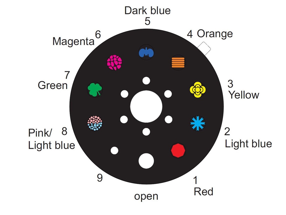 Gobohjul med statiske gobos, 1 gobo, 8 farvegobos og åben
