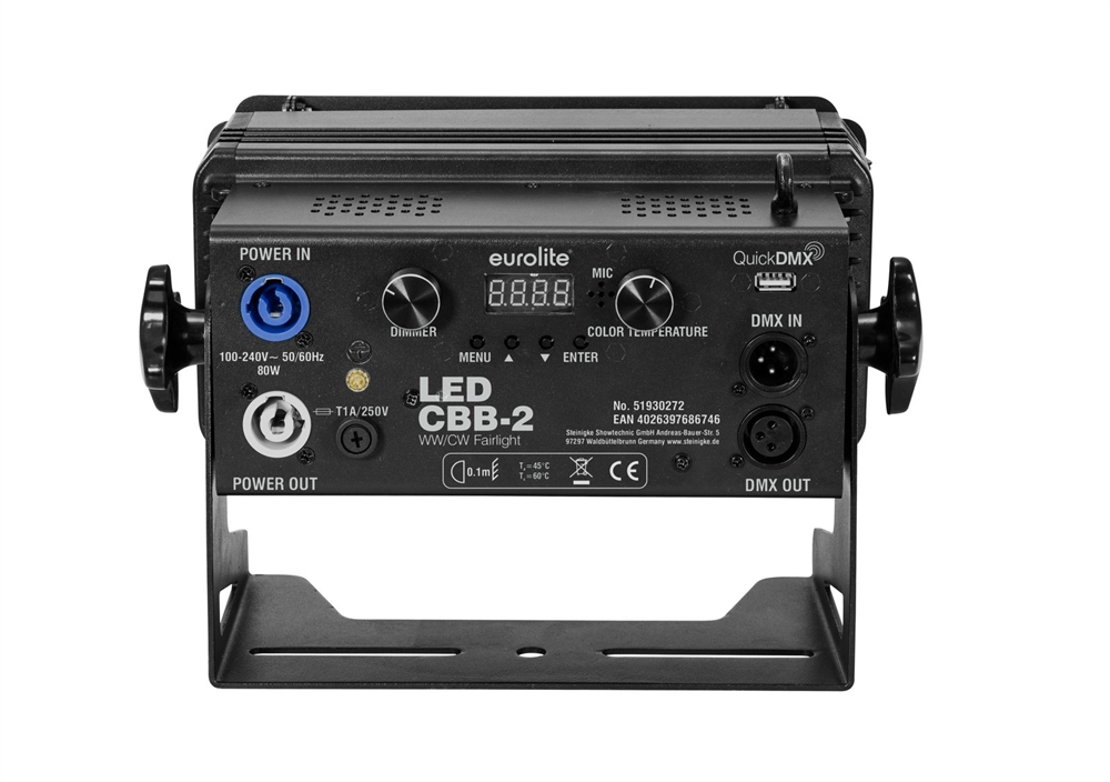 | Control: | Stand-alone; DMX; QuickDMX via USB (optional); IR remote control; Quick select potentiometer for brightness and color temperature; Master/slave function; Sound to light via Microphone |