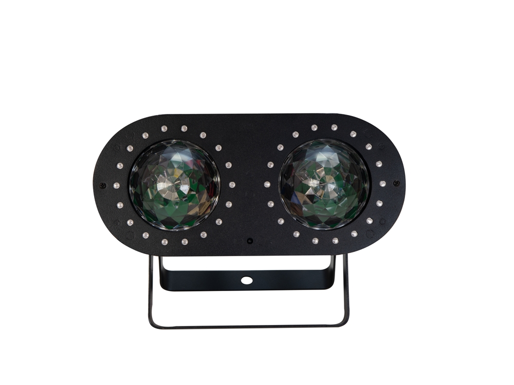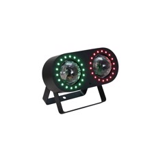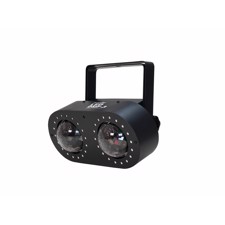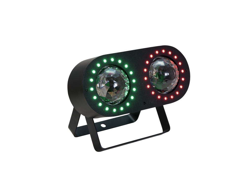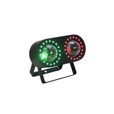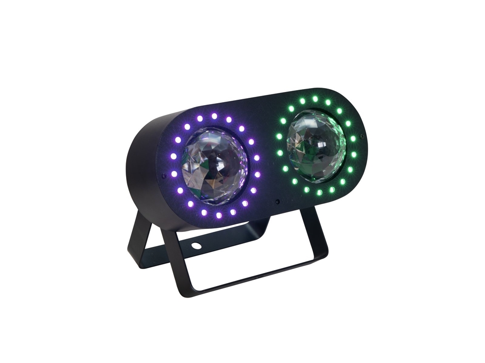 Effektlys med blomst- og stroboskopeffekt, inkl. IR-fjernbetjeningEUROLITE LED DMF-3 Hybrid Flower Effect er perfekt til soloundeholdere, små bands og festlokaler. Bag de to linser er den udstyret med i alt 12 LED'er i farverne rød, grøn, blå, rav, hvid og UV. De to stroboskopring på effekten har 36 RGB LED'er, som skaber hurtige og dynamiske strobeeffekter. Blomst- og strobelysene kan styres separat. Du kan styre dem enten via DMX, ved hjælp af musikstyring via mikrofonen med justerbar følsomhed, via master/slave-funktionen eller med den medfølgende infrarøde fjernbetjening. Fire indbyggede showprogrammer er tilgængelige i automatisk og musiktilstand. Adressedering og indstillinger foretages via den integrerede styreenhed med 4-cifret LED-display. Leveringsomfanget inkluderer også en svingbar monteringsbeslag og en ekstra beslag til opstilling af lysvirkningen direkte på gulvet.