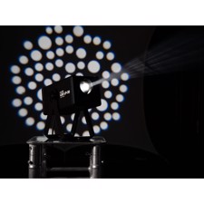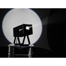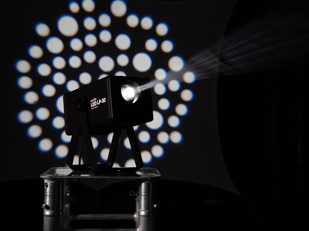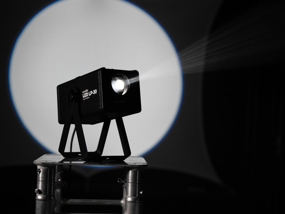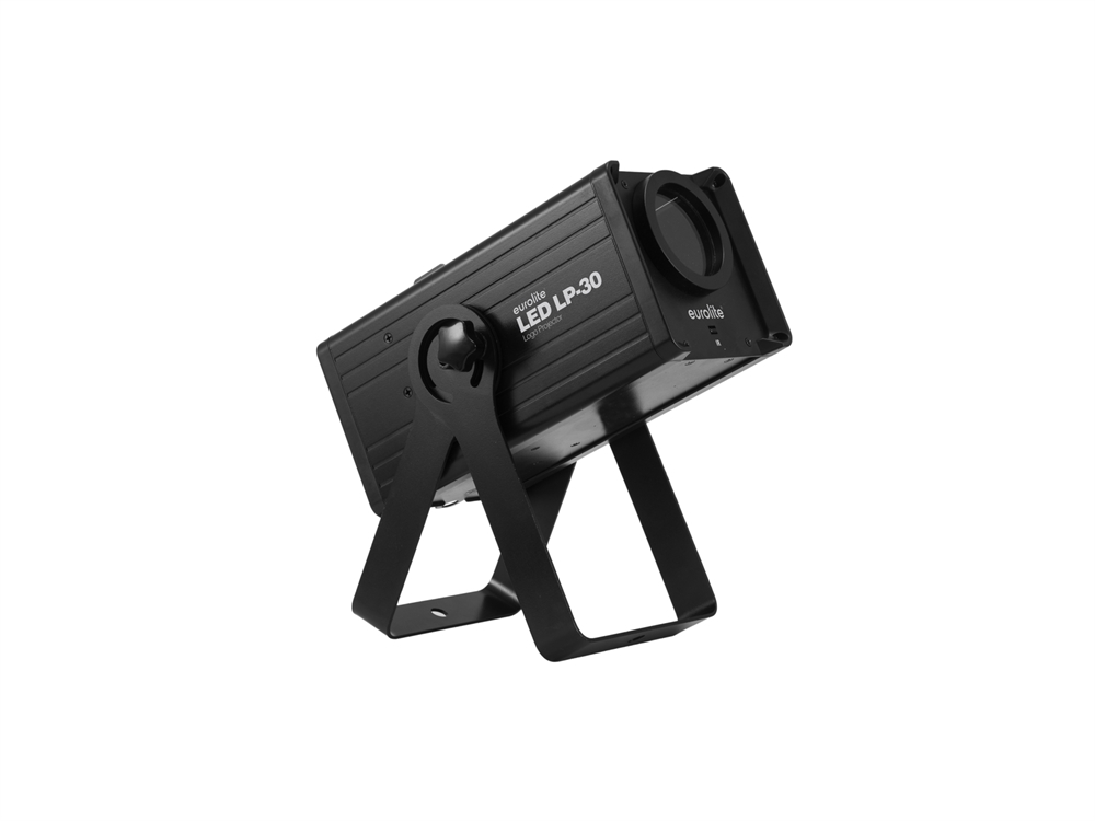 LED logo projector with 30 W LED incl. IR remote controlUse the EUROLITE LED LP-30 to advertise your booth with your company logo projected on the ceiling or throw a Christmas motif directly from your shop window onto the street to attract the full attention of passers-by. The LP-30 logo projector is completely silent as it is equipped with convection cooling. The sharp and flicker-free projection is made possible by the powerful, cool white 30-watt COB LED. Different gobos can be easily changed and inserted. Switch conveniently between static or rotating gobos and control the rotation speed and direction according to your needs. A gobo with "bubbles" motif is included in the delivery.The logo projector also features a dimmer, pre-programmed macros and a variable speed strobe effect with a random generator. You can control the projector either via DMX, master/slave or with the included infrared remote control. The logo projector is also compatible with QuickDMX - the wireless DMX system from Eurolite. The P-Con mains connection allows you to operate up to eight devices in series. You can address and set the LP-30 via the control board with LCD display.