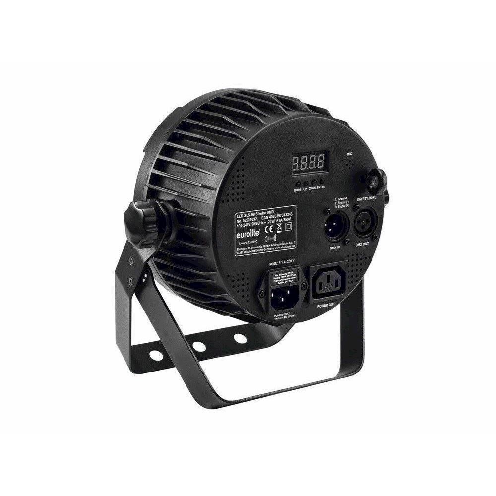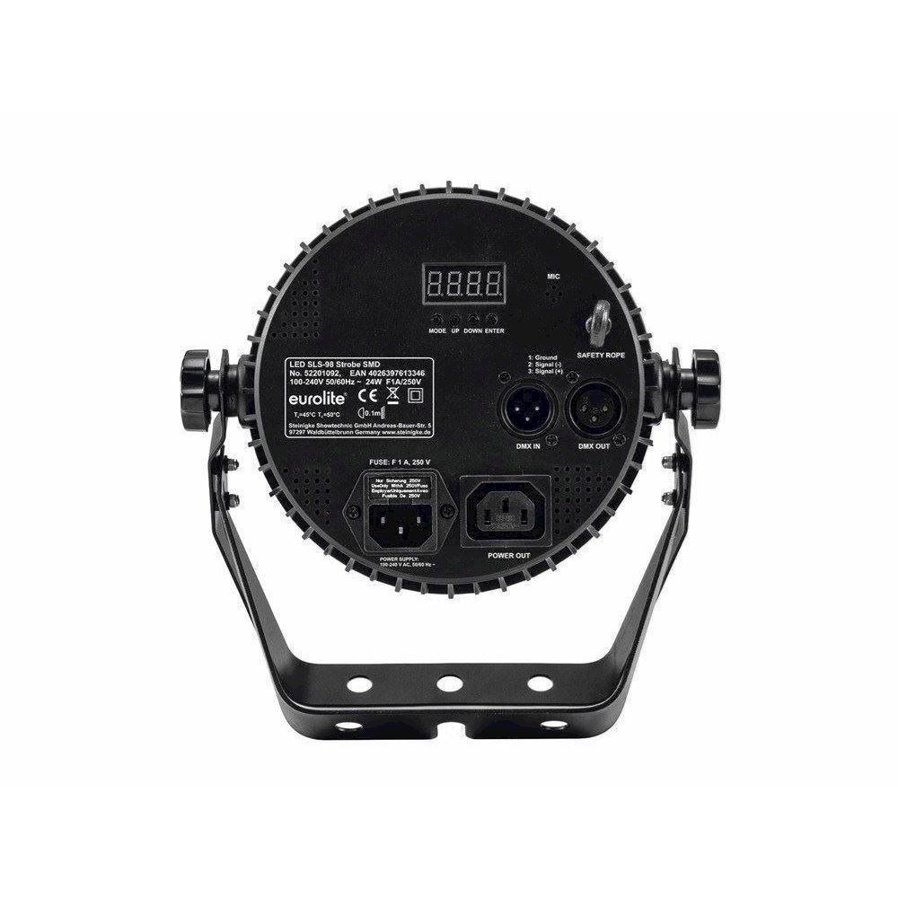 Her er du: Disconetto » LYS » Lyseffekter » Stroboskoper & Blinder » Stroboskoper. DMX Eurolite LED SLS-98 Strobe SMD På lager På lager, 3-5 hverdage Bedømmelse for Eurolite LED SLS-98 Strobe SMDProduktet er endnu ikke bedømt Før 909,00829,00DKK ved 1 stk. Vis uden moms Trustpilot Kompakt strobe med 98 SMD LED'er og DMX, LED ringe er individuelt styrbar Compact strobe with 98 SMD LEDs & DMX, each ring individually controlableOperable in stand-alone mode or via DMXDMX512 control possible via any commercial DMX controller (occupies max. 9 channels)4 or 9 DMX channels selectable for numerous applicationsEach LED ring (or ring combination) can be controlled individually via DMXMaster/Slave function for synchronous operation with several devicesSound-controlled via built-in microphone, adjustable microphone sensitivityEquipped with 98 SMD 5030 LEDsFlat housing form requires minimal space when riggingSecond mounting bracket for safe standing installationFlicker-free projectionFan-cooledComfortable addressing and setting via control panel with LED display and four operating buttonsAdditional controlling possibility via the EUROLITE IR-7 remote control, included in deliveryFunctions: internal programs, sound-control, Blinder effect, dimmer, adjustable flash-rate (1-20 flashes/sec), Master/SlaveAdjustable internal program speedReady for connection via included power cableFeed-through output allows to power up to 8 devicesSwitch-mode power supply for operation between 100 and 240 voltsColor generation: CWStrobe color: White Power supply:100-240 V AC, 50/60 HzDMX channels:4/9DMX connection:3-pin XLRSound-control:via built-in microphoneFlash-rate:20 HzLED number:98LED type:0.5 W SMD 5030, 5900 KDimensions (L x W x H):120 x 215 x 245 mmWeight:1 kgPower consumption:24 WLamp type:LEDHeight:24,5 cmDepths:12 cmWidth:21,5 cmEcodesign regulation:YesSpecial product:Not designed for household room illuminationPurpose:Show effect lighting Varenr.: E-52201092 Vi anbefaler ROADINGER Flightcase 4x SLS, size M DKK 2.309,00 Sikkerheds wire A 3x600mm Op til 5kg DKK 59,00 Sikkerheds wire A 3x600mm Op til 5kg, Sort DKK 59,00