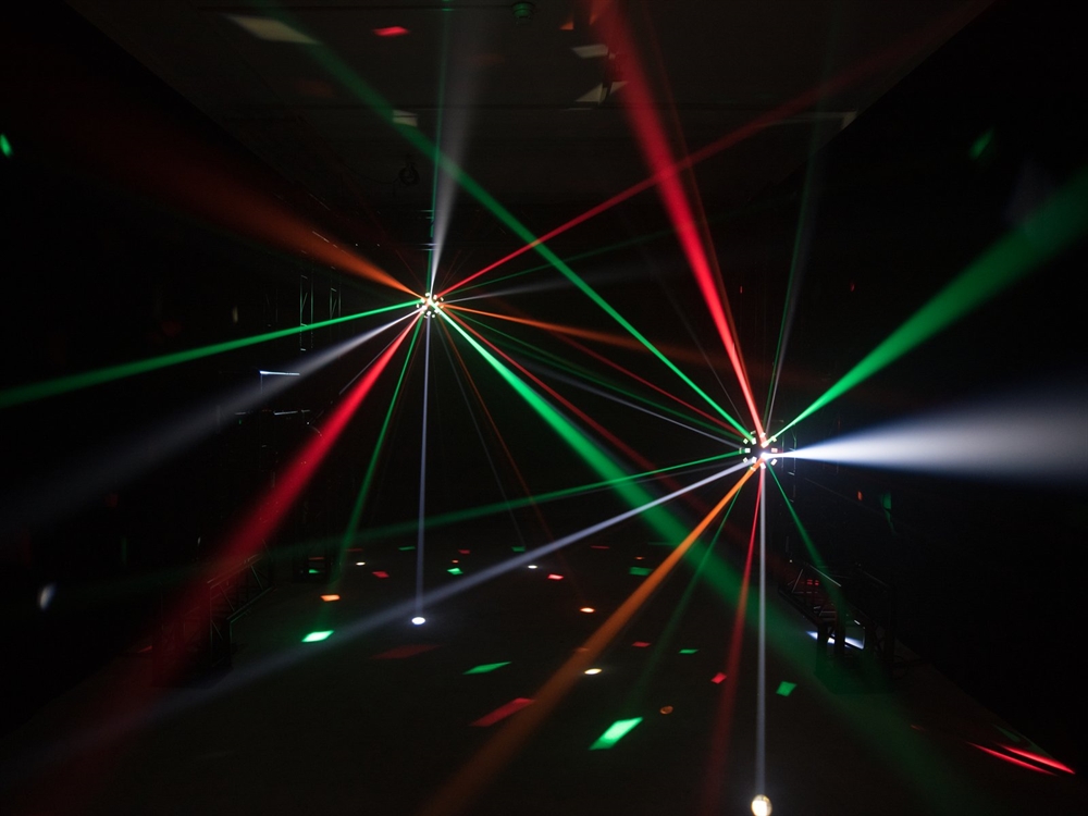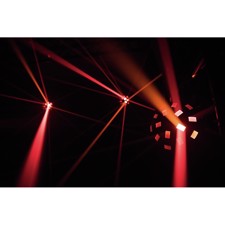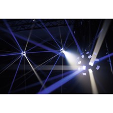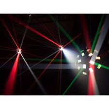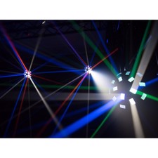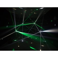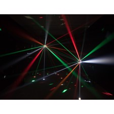 Denne lyseffekt med fem 10 Watt LED'er i RGBWA giver dynamiske stroboskop- og derbyeffekter. Den er en absolut øjenfanger til enhver fest. De flerfarvede stråler ændrer deres bevægelsesretning i en konstant rytme. Lyseffekten er kompatibel med QuickDMX, det trådløse DMX-system fra Eurolite.