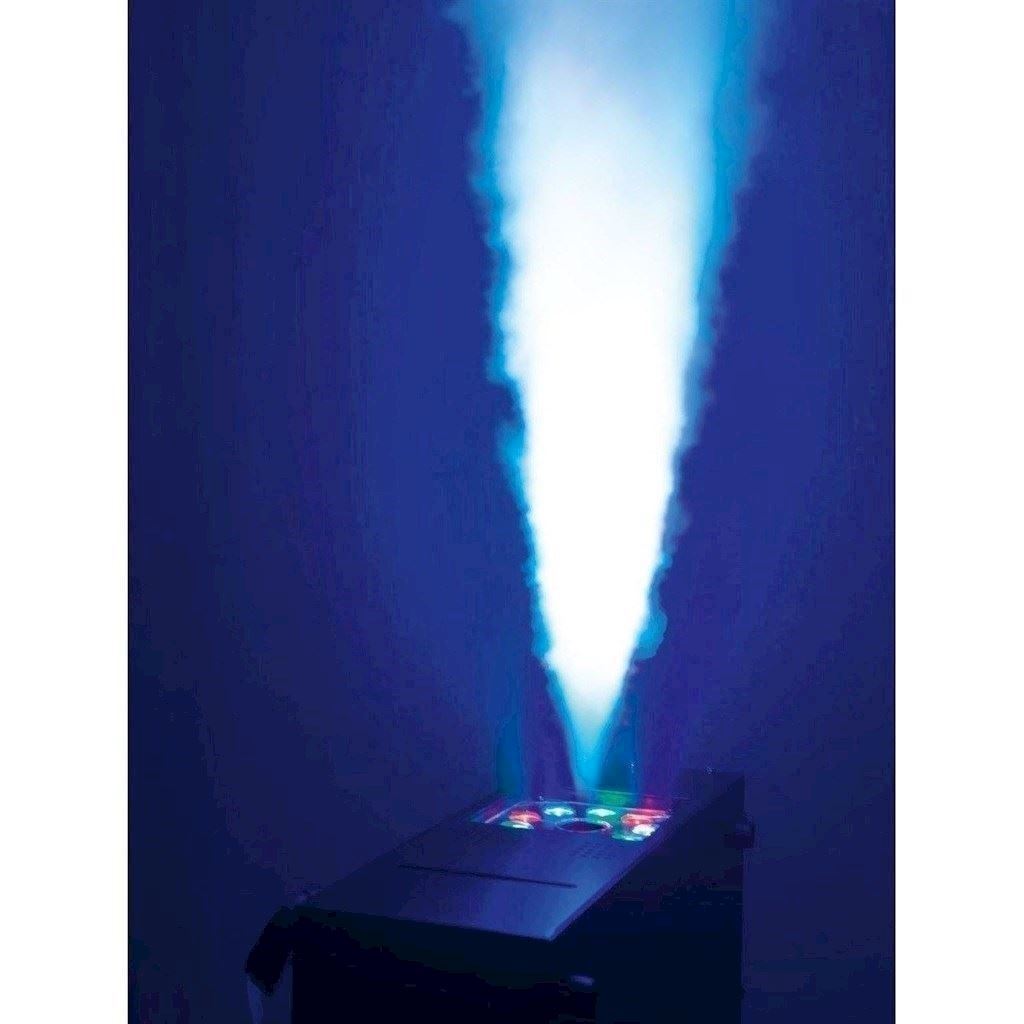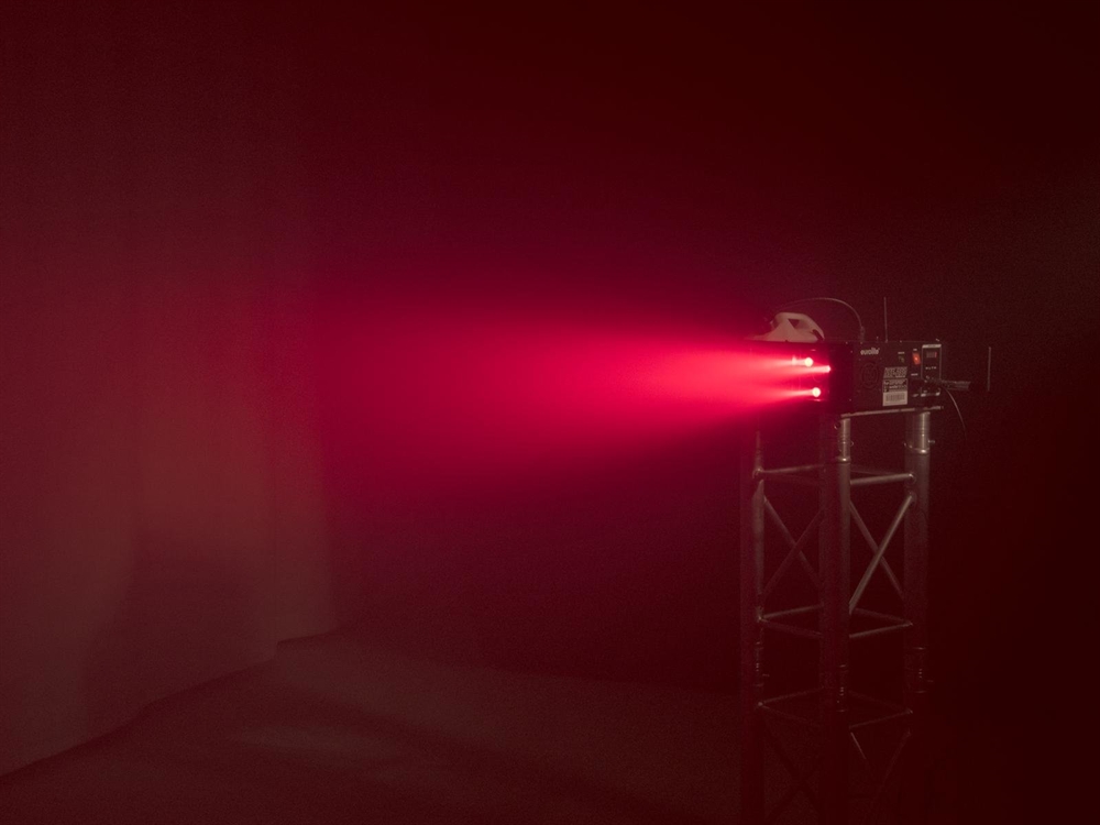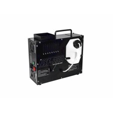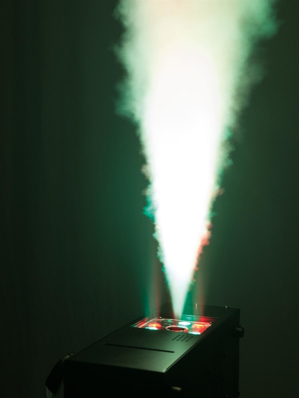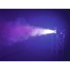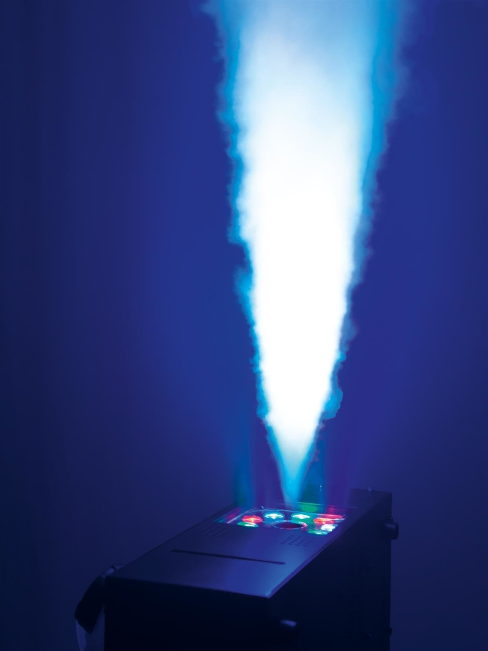 Thanks to the 9 built-in 3 W LEDs, the up to 3 meters high fog fountain appears in a wide variety of colours and can therefore be perfectly matched to the rest of the light show. The fog fountain can stop for up to 30 seconds. The NSF is controlled via 8 DMX channels or via the enclosed radio remote control.