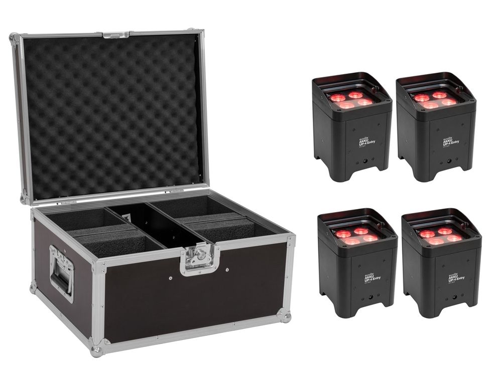 Her er du: Disconetto » LYS » Lamper og Belysning » LED Accu/Batteri Lamper » LED Accu Sæt Eurolite sæt: 4 x AKKU UP-4 Entry QCL Spot + Case Ikke på lager Forventet levering om ukendt antal uger Bedømmelse for Eurolite sæt: 4 x AKKU UP-4 Entry QCL Spot + CaseProduktet er endnu ikke bedømt 9.599,00DKK ved 1 stk. Vis uden moms Trustpilot EUROLITE Set 4x AKKU UP-4 Entry QCL Spot + Case Dette sæt bestående af: 4 x EUROLITE AKKU UP-4 Entry QCL Spot 1 x ROADINGER Flightcase 4x AKKU UP-4 Entry/IP UP-4 Entry EUROLITE AKKU UP-4 Entry QCL SpotBattery-powered uplight with 4 x 8 watt 4in1 LED and IR remote controlCordless and versatileEnergy-saving modeStepless color blend, color change, color fade, dimmer and strobe effectM10 threaded insert for suspended installationSturdy housing with handle and folding foot for angled placementMains input and output for power linking up to 8 unitsBattery operation up to 14h depending on program used4 powerful LEDs 8 W high-power 4in1 QCL RGBW (homogenous color mix)Integrated ShowprogramsDirect color selection for 17 preset colorsCan be operated in 3; 4-1; 4; 6; 8 CH modeThe device is cooled by passive convection coolingControlling by stand-alone; IR remote control; DMX; Master/slave function; Sound to light via Microphone; QuickDMX via USB (optional); W-DMX by wireless solution via USB (optional); CRMX by LumenRadio via USB (optional)Preprogrammed in Light CaptainFlicker-freeWith a beam angle of 17°4 digits 7-segment LED displayPackage contents1 x device, 1 x user manual, 1 x power cord, 1 x remote control, 1 x batteryROADINGER Flightcase 4x AKKU UP-4 Entry/IP UP-4 EntryHigh-quality workmanship with birch multiplex 6 mm, dark brownInterior with foam paddingcover with foam paddingAluminum profile frames 22mm with rounded edges2 hinged, chromium plated case handles2 chrome tip-over locks1 high-quality butterfly lockMade in Europe Weight:19,15 kgEUROLITE AKKU UP-4 Entry QCL SpotPower supply:100-240 V AC, 50/60 HzIP classification:IP20Protection class:Class IPower connection:Mains input via IEC connector (M) mounting version power supply cord with safety plug (provided)Power output:IEC connector (F) mounting versionFuse:T 1 A Fuse replaceableBattery pack type:1 x lithium ion 11,1 V, 4400 mAh, 48,84 WhBattery pack:Battery operation up to 14h depending on program usedRecharging time 4hLamp type:LED lampLED:4 x 8 W high-power 4in1 QCL RGBW (homogenous color mix)Flash rate:0 - 20 HzDMX channels:3; 4-1; 4; 6; 8DMX input:3-pin XLR (M) mounting versionDMX output:3-pin XLR (F) mounting versionCooling:Passive convection coolingControl:Stand-alone; IR remote control; DMX; Master/slave function; Sound to light via Microphone; QuickDMX via USB (optional); W-DMX by wireless solution via USB (optional); CRMX by LumenRadio via USB (optional); Light CaptainBeam angle:17°Beam angle (1/2 peak):17°Beam angle (1/10 peak):34°Housing color:BlackDisplay type:4 digits 7-segment LED displayDimensions:Width: 14,4 cmDepth: 14,4 cmHeight: 19,1 cmWeight:2,35 kgRemote controlBattery:1 x Button cell 3.0 V CR2025 lithium manganese built-inLegal specificationsSpecial product:Not designed for household room illuminationIntended use:Show effect lightingROADINGER Flightcase 4x AKKU UP-4 Entry/IP UP-4 EntryMaximum load:50 kgAluminum profile frames:22 mmCase handles:2 pc/pcsStop hinge:2 pc/pcsLock:Butterfly lock: 1 pc/pcsMaterial:Birch multiplex, 6 mm, laminatedColor:Dark brownDevice compartment:18 cm x 18,5 cm x 23 cmAccessory compartment:10 cm x 40 cm x 24 cmDimensions:Width: 52 cmDepth: 43 cmHeight: 30 cmWeight:9,75 kg Varenr.: E-20000934