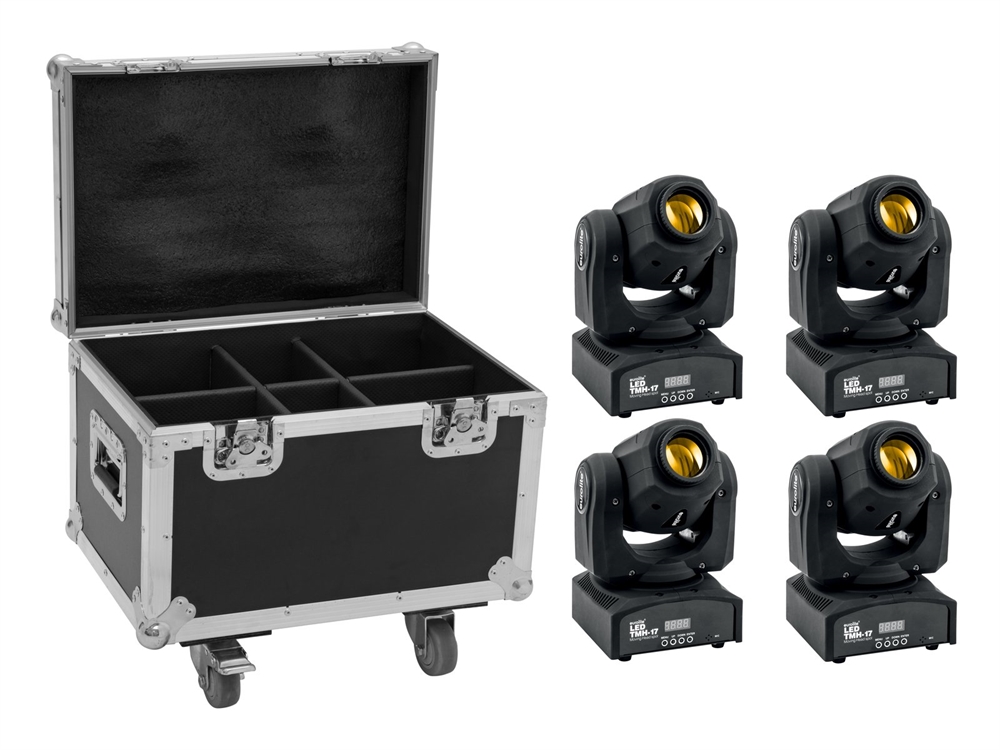 Her er du: Disconetto » brand » Eurolite Eurolite sæt: 4 x LED TMH-17 Spot + Case with wheels På lager På lager, 3-5 hverdage Bedømmelse for Eurolite sæt: 4 x LED TMH-17 Spot + Case with wheelsProduktet er endnu ikke bedømt 10.979,00DKK ved 1 stk. Vis uden moms Trustpilot EUROLITE Set 4x LED TMH-17 Spot + Case with wheels Set consisting of:: 4 x EUROLITE LED TMH-17 Moving Head Spot 1 x ROADINGER Flightcase 4x LED TMH-13/17/S30/W36 with wheels EUROLITE LED TMH-17 Moving Head SpotHandy sized spotlight with 30 W LED, gobos and color wheelCompact lightweight1 powerful LED 30 W COB (chip-on-board) color wheelPositioning within 540° PAN and 200° TILTExact positioning (16 bit resolution)Gobo wheel with static gobos; Focus manualGobo effect; beam effect; Strobe effectColor wheel with 7 dichroic filters plus openhalf colors selectable, Rainbow effect with adjustable speed in both directionsGobo wheel with static gobos, 7 gobos and openIntegrated show programsThe device is cooled by cooling fanControl via stand-alone; DMX; Sound to light via MicrophoneWith a beam angle of 12°4 digit 7-segment LED displayDimmer electronicPreprogrammed in LED PC-Control 512; EASY SHOW 1; Light Captain; EASY SHOW 2; EASY SHOW 3For application areas such as: Clubs/dancing school; Party room; mobile djs / entertainer; small rentalApplication possibility: Standing; suspendedPackage contents1 x moving light, 1 x user manual, 1 x power cord, 1 x omega bracket, 2 x screw, 4 x washer, 1 x safety eyeletROADINGER Flightcase 4x LED TMH-13/17/S30/W36 with wheelsTrunk case with castorsHigh-quality workmanship with plywood multi-layer glued 7 mm, black, laminatedInterior with foam paddingcover with foam paddingAluminum profile frames 30mm with rounded edges2 hinged, chromium plated case handles2 chrome tip-over locks2 high-quality butterfly locksCastors Weight:26,06 kgEUROLITE LED TMH-17 Moving Head SpotPower supply:100-240 V AC, 50/60 HzPower consumption:50 WIP classification:IP20Power connection:Mains input via IEC connector (M) mounting version power supply cord with safety plug (provided)Lamp type:LED lampLED:1 x 30 W COB (chip-on-board) color wheelMax. TILT movement:200° Exact positioning (16 bit resolution)Max. PAN movement:540° Exact positioning (16 bit resolution)Equipment:Gobo wheel with static gobos; Focus manualColor generation:Color wheel with 7 dichroic filters plus openHalf colors selectable, Rainbow effect with adjustable speed in both directionsGobos:Gobo wheel with static gobos, 7 gobos and openDMX channels:9; 11DMX input:1 x 3-pin XLR (M) mounting versionDMX output:1 x 3-pin XLR (F) mounting versionCooling:Cooling fanControl:Stand-alone; DMX; Sound to light via MicrophonePreprogrammed in:LED PC-Control 512; EASY SHOW 1; Light Captain; EASY SHOW 2; EASY SHOW 3Beam angle:12°Beam angle (1/2 peak):12°Illuminance in Lux (lx):Cold white (CW) 3m: 1677 lx, 6m: 417 lxHousing color:BlackDisplay type:4 digit 7-segment LED displayDimensions:Width: 17 cmDepth: 14,5 cmHeight: 24 cmWeight:2,70 kgNoise classification:Class 3 (clearly perceptible sounds)Legal specificationsSpecial product:Not designed for household room illuminationIntended use:Show effect lightingROADINGER Flightcase 4x LED TMH-13/17/S30/W36 with wheelsMaximum load:50 kgAluminum profile frames:30 mmCase handle:2 pc/pcsStop hinge:2 pc/pcsLock:Butterfly lock: 2 pc/pcsTransport aid:CastorsMaterial:Plywood multi-layer glued, 7 mmColor:Black, laminatedDevice compartment:18 cm x 15,5 cm x 29 cmAccessory compartment:10 cm x 15,5 cm x 29 cmInside dimensions:49 cm x 32,5 cm x 29 cmDimensions:Width: 55 cmDepth: 38 cmHeight: 47 cmWeight:12,90 kg Varenr.: E-20001012
