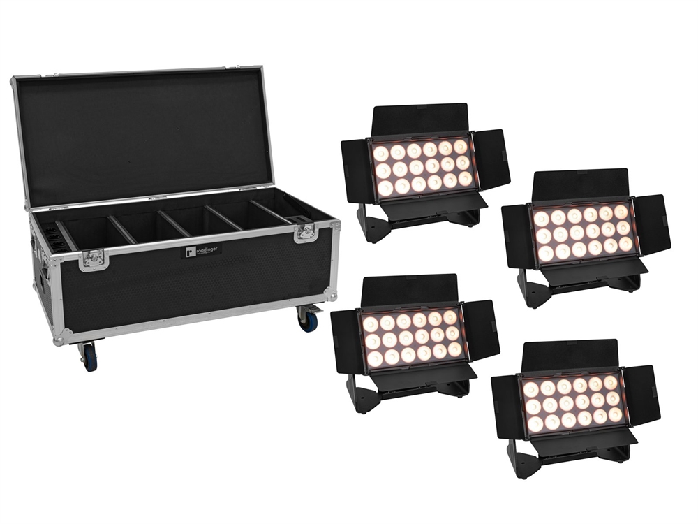 1 x ROADINGER Flight case til 4x AKKU Multiflood IP 18x10W RGBW Wash CRMX med opladningsfunktion