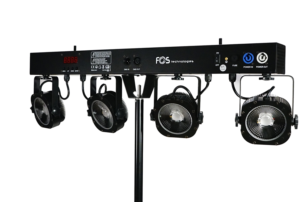 Led Par System, 4 leds 30 watt COB RGBW , Pixel Control, 25° Beam Angle, DMX mode , IR remote, powercon in/out, built in programs, black stand included.